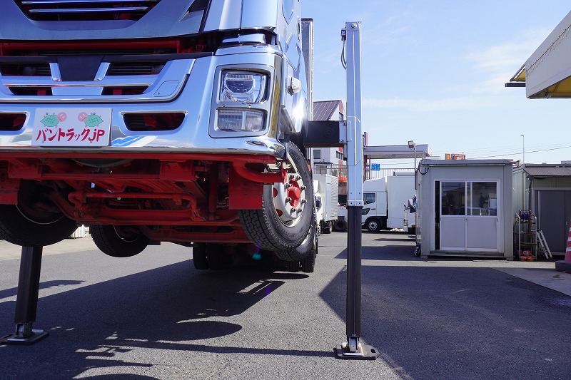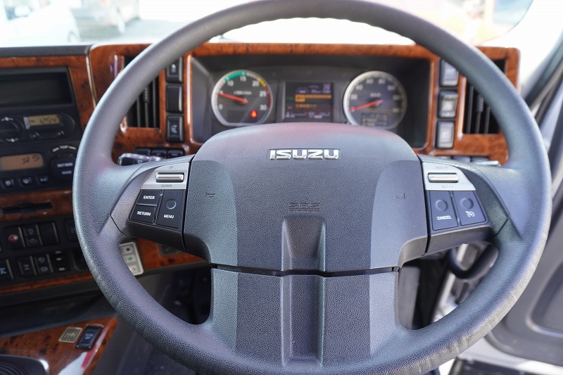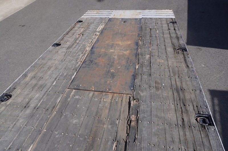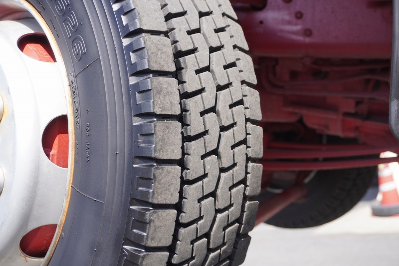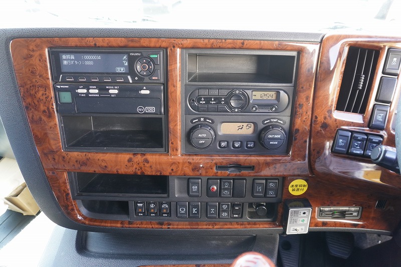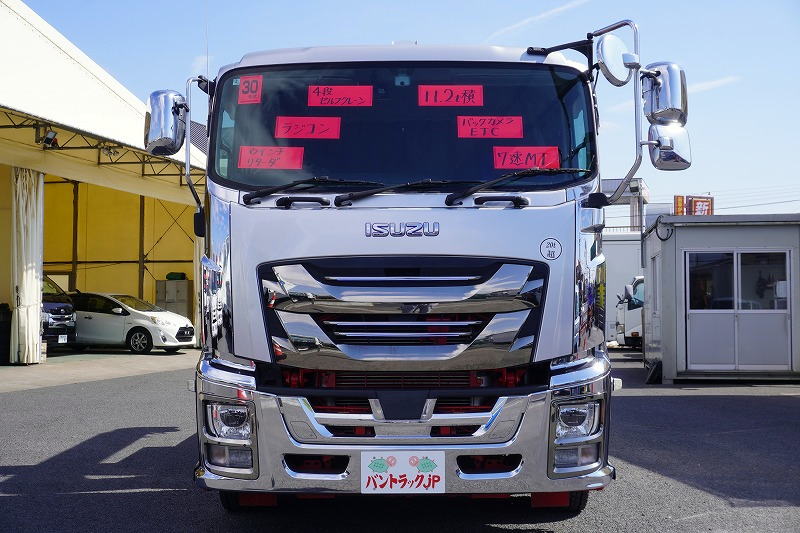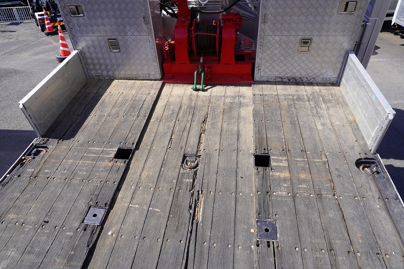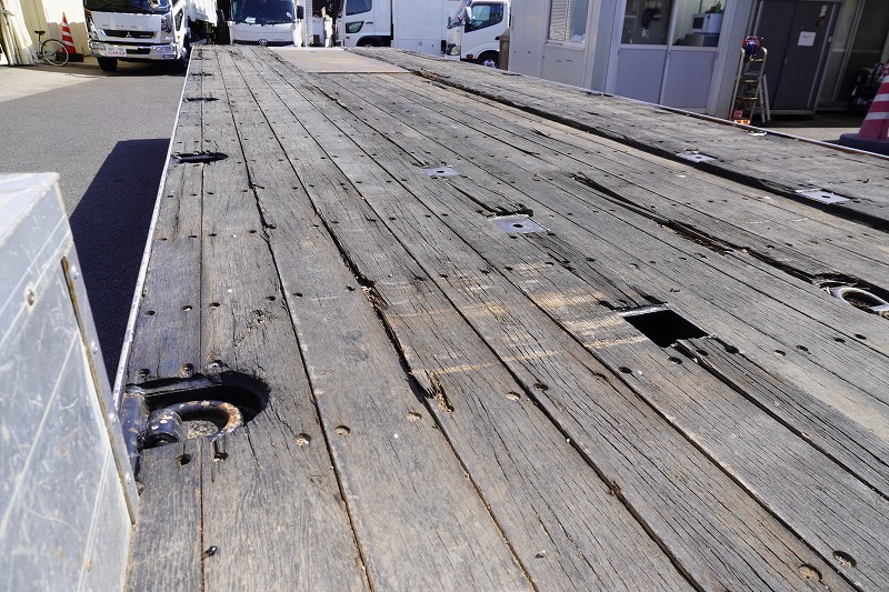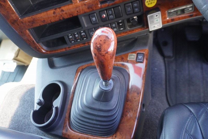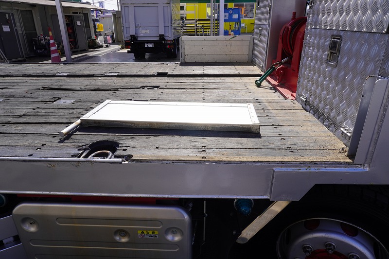 在庫No.K-0306 ギガ 大型 4軸 2デフ リーフサス 「ベッド付き」 4段セルフクレーン 積載11200kg 古河ユニック製 ラジコン フックイン 2.93t吊 ウインチ 造りボディー リターダ 鳥居シマ板張り&埋め込み式工具入れ&ラダー付き 床フック アユミ板掛け&アユミ板付き バックカメラ ETC メッキパーツ 回送仕様 7速MT!総重量25トン未満! 車検「R9年3月まで!」 AK