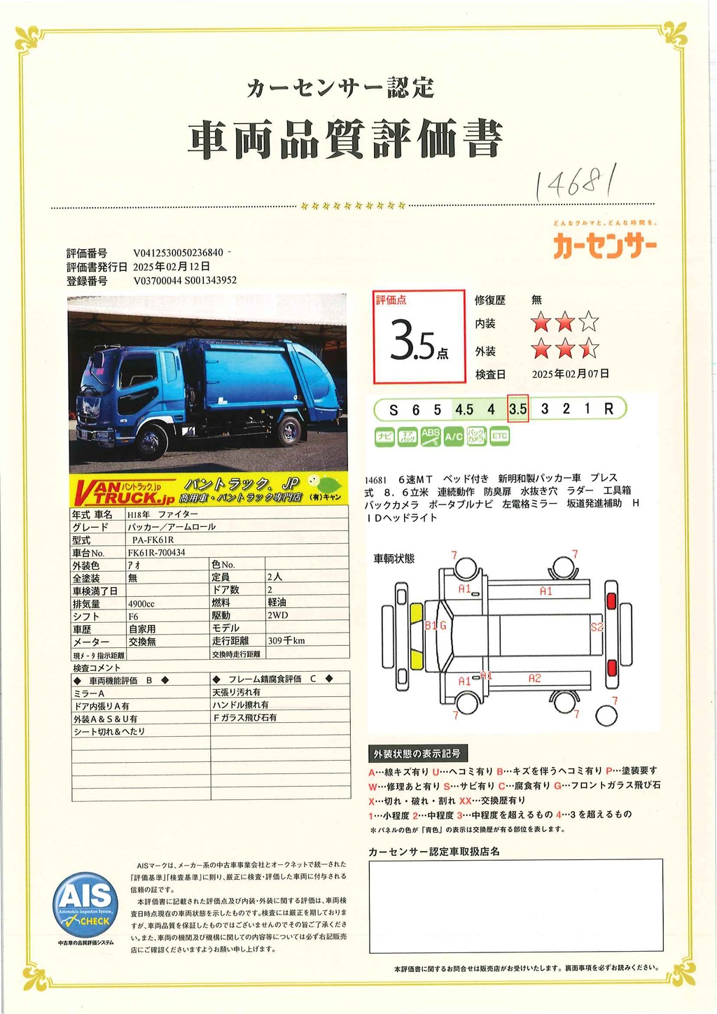 在庫No.C-0681 ファイター 4トン 「ベッド付き」 パッカー車 プレス式 積載1900kg 新明和製 8.6立米 連続動作 防臭扉 ラダー 工具箱 バックカメラ 社外ナビ ETC 坂道発進補助 メッキパーツ 6速MT!程度良いです!