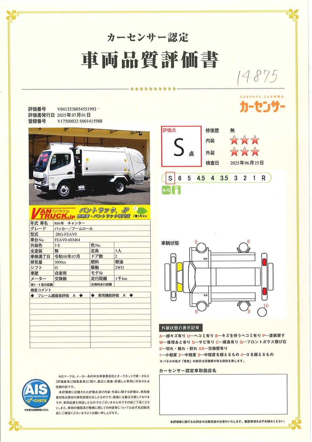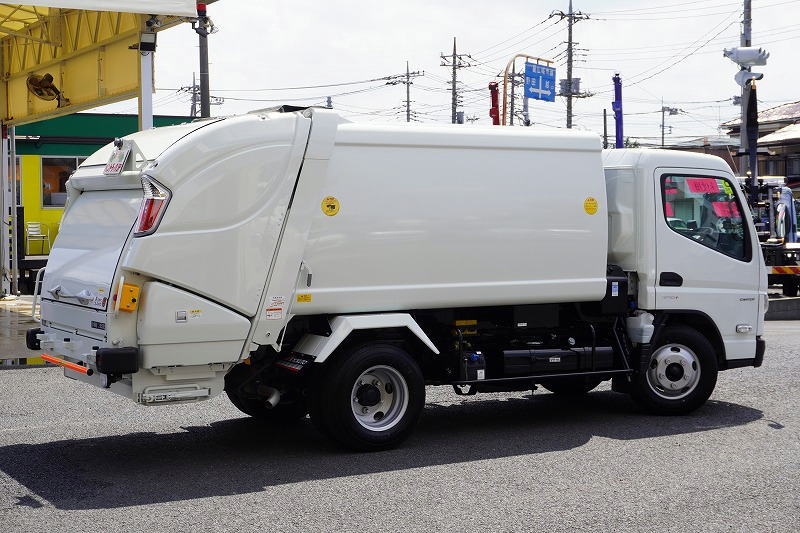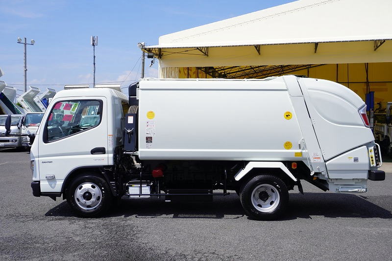 在庫No.C-0875 (未使用) キャンター 「標準幅」 パッカー車 プレス式 積載2050kg 極東製 5.3立米 連続動作 汚水タンク 網工具入れ 左電格ミラー LEDヘッドライト スマートキー 衝突軽減ブレーキ 車線逸脱警報 5速MT!車検「R8年7月まで!」