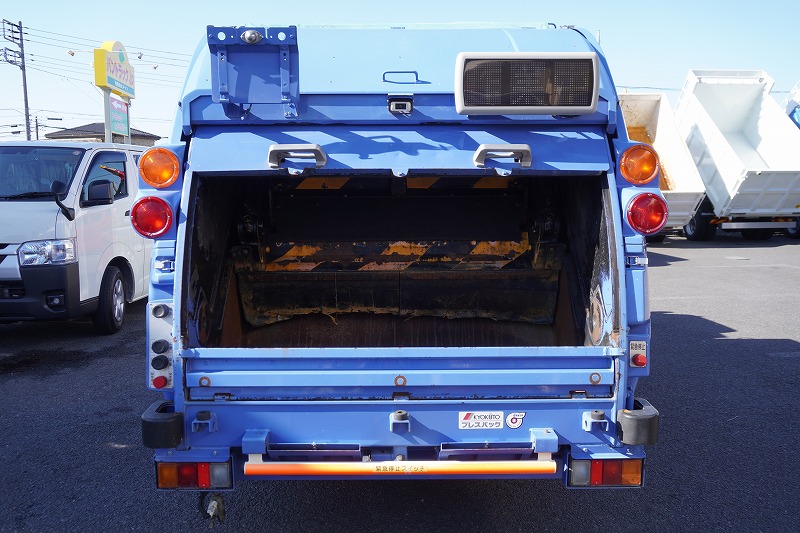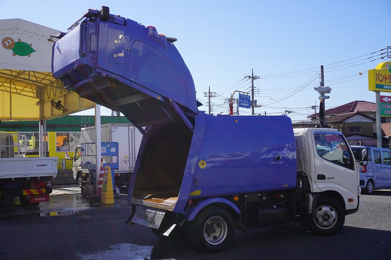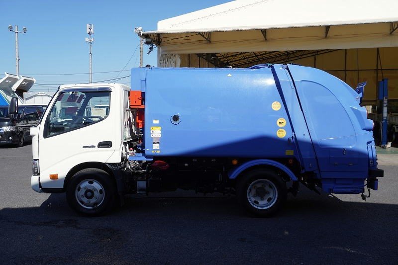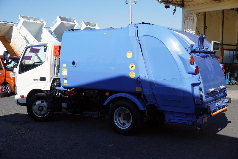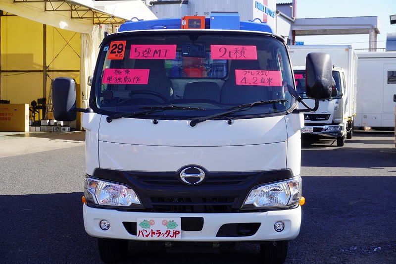 在庫No.K-0157 デュトロ 「標準幅」 パッカー車 プレス式 積載2000kg 極東製 4.2立米 単独動作 汚水タンク バックカメラ 作業中表示灯 LEDフォグランプ 電動パーキングブレーキ 左電格ミラー 坂道発進補助 5速MT! 車検「R8年9月まで!」
