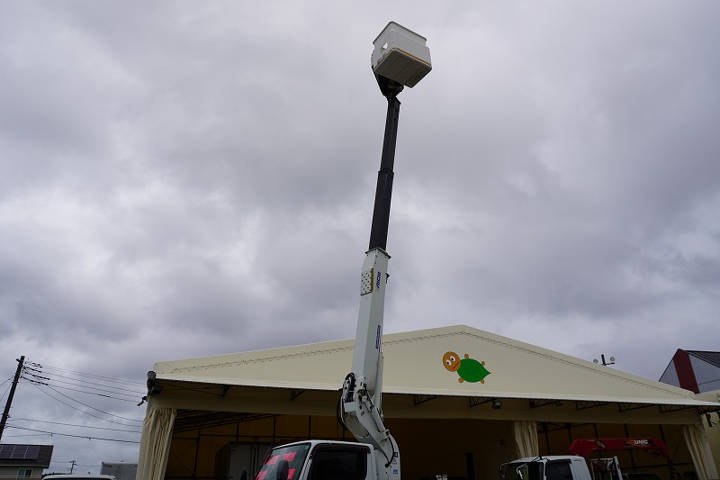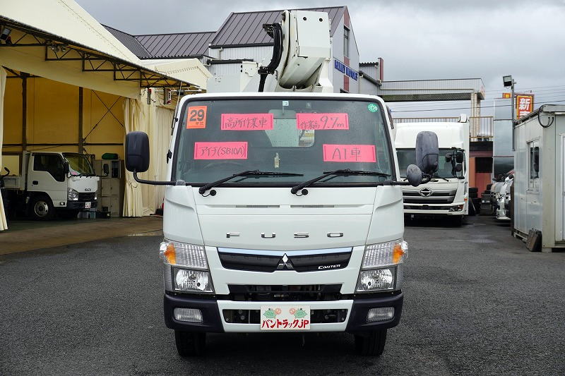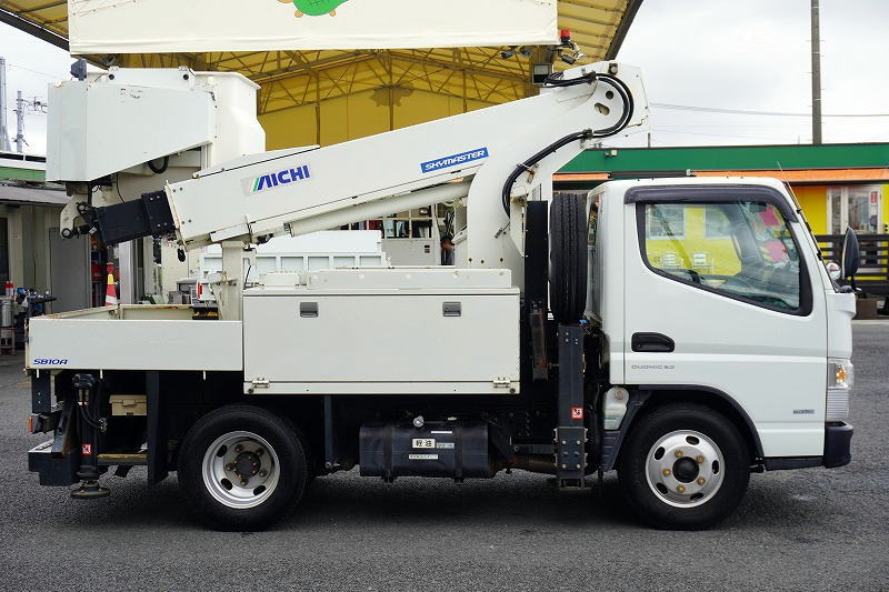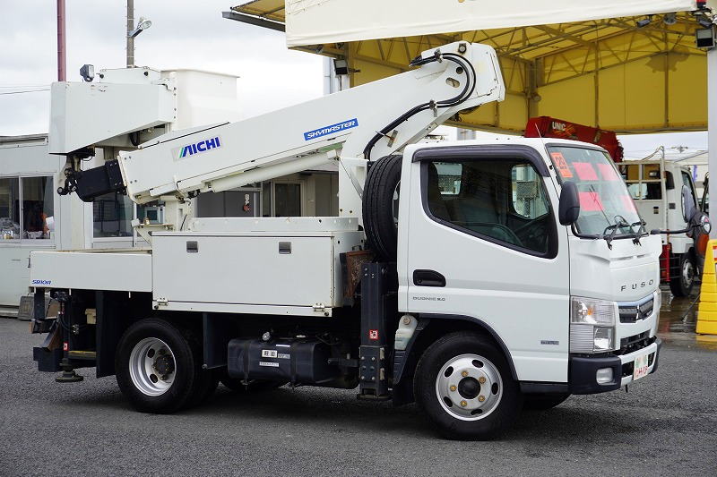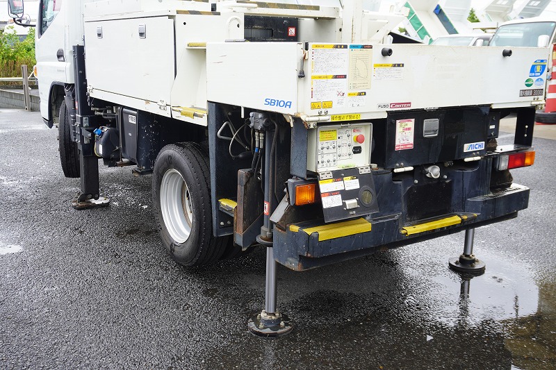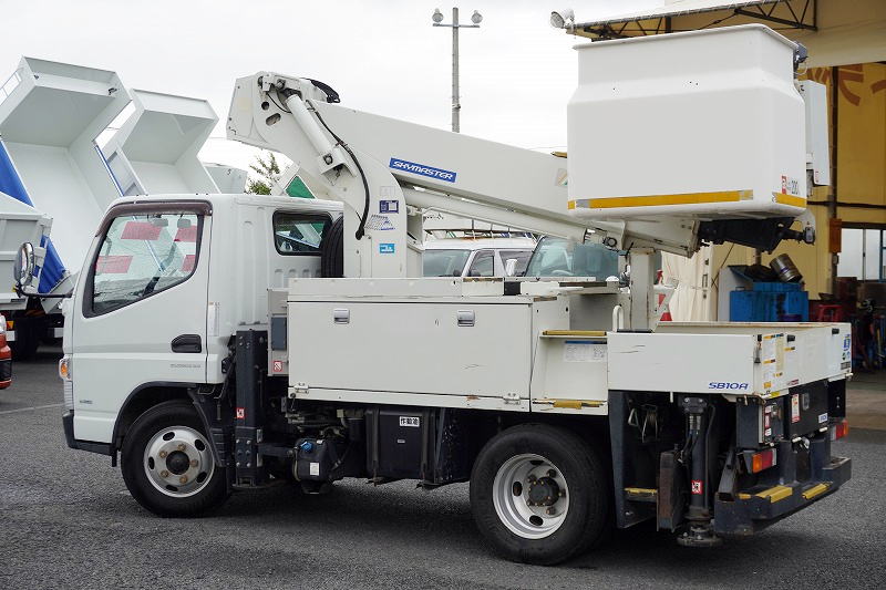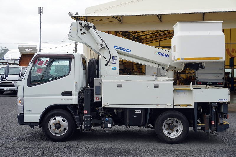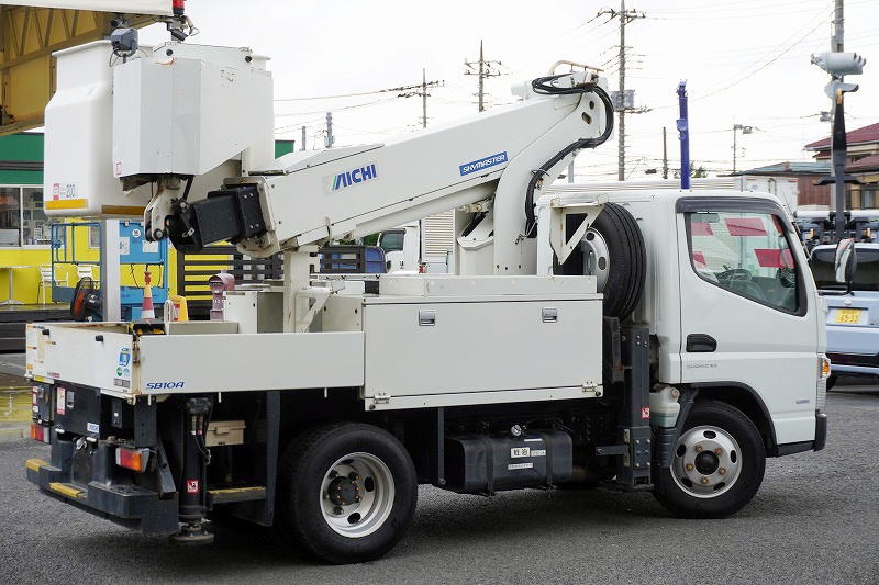 在庫No.C-0949 キャンター 高所作業車 アイチ製(SB10A) 最大地上高9.7m FRPバケット バケット積載荷重200kg 積載300kg 工具入れ ジョイスティックタイプ アワーメーター:2135h 左電格ミラー 社外ナビ バックカメラ フォグランプ 通信工事仕様!AT車!