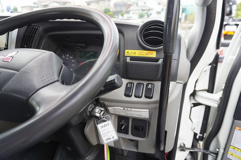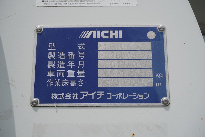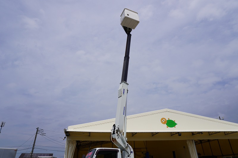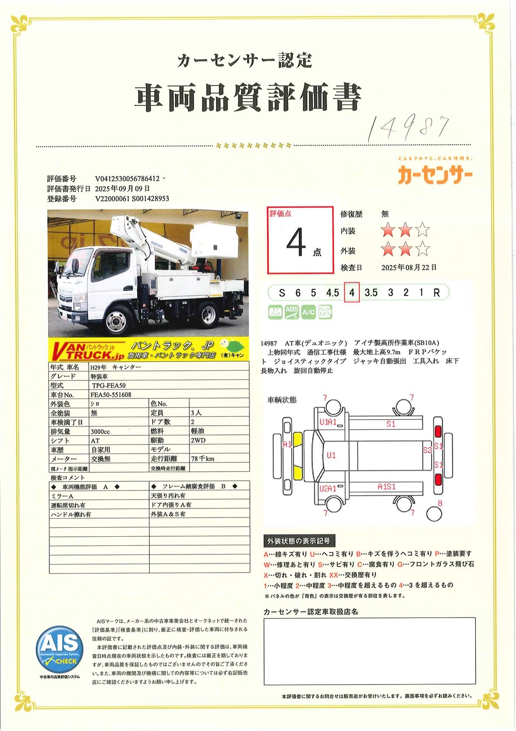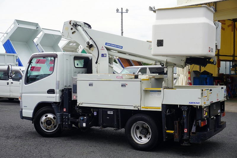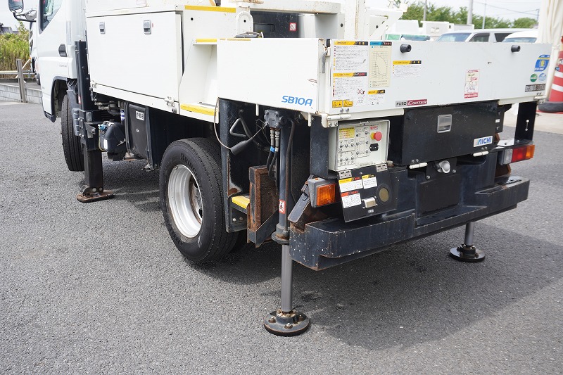 在庫No.C-0987 キャンター 高所作業車 アイチ製(SB10A) 最大地上高9.7m FRPバケット バケット積載荷重200kg 積載300kg 工具入れ ジョイスティックタイプ アワーメーター:7651h 左電格ミラー バックカメラ フォグランプ 通信工事仕様!AT車!
