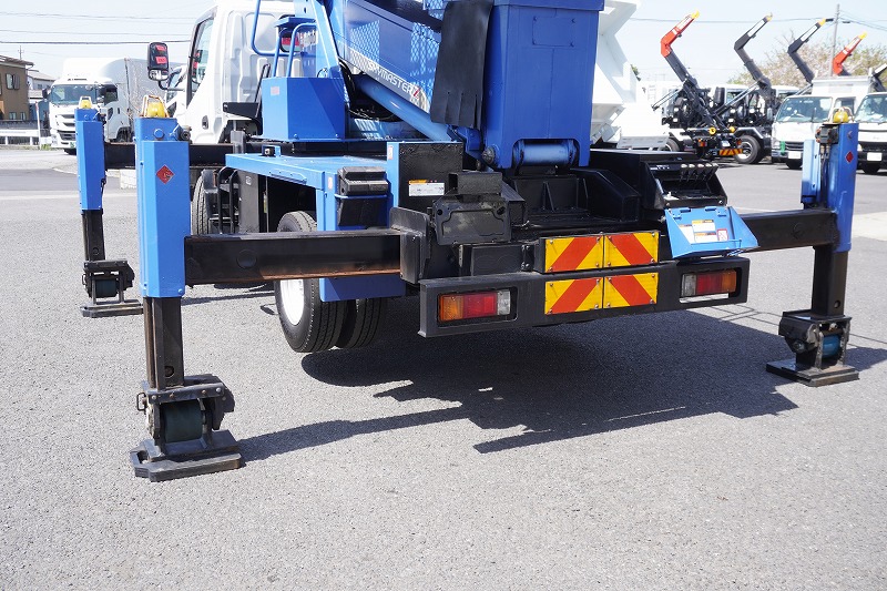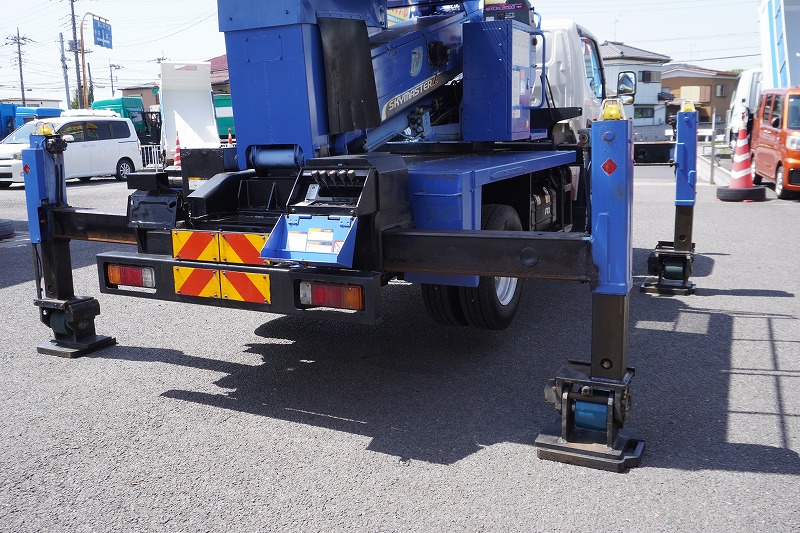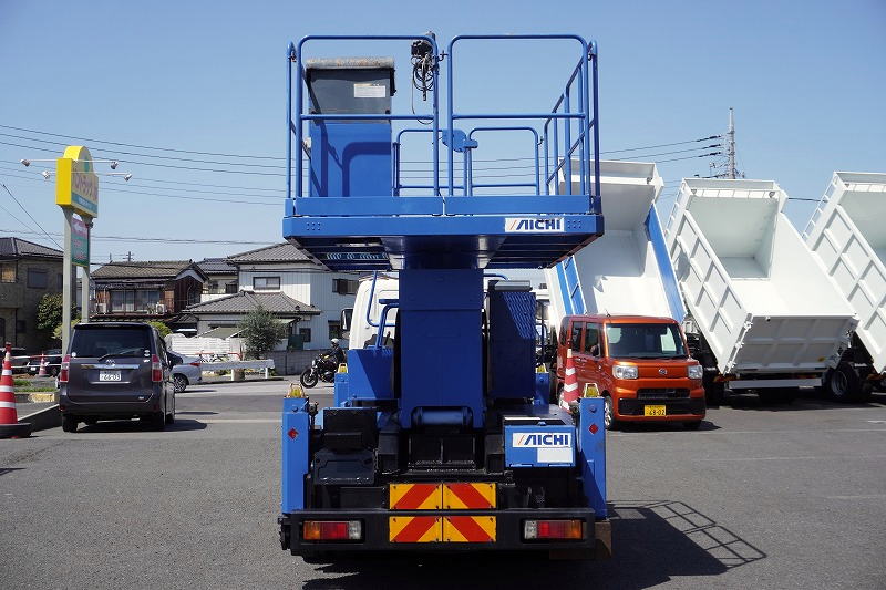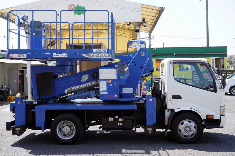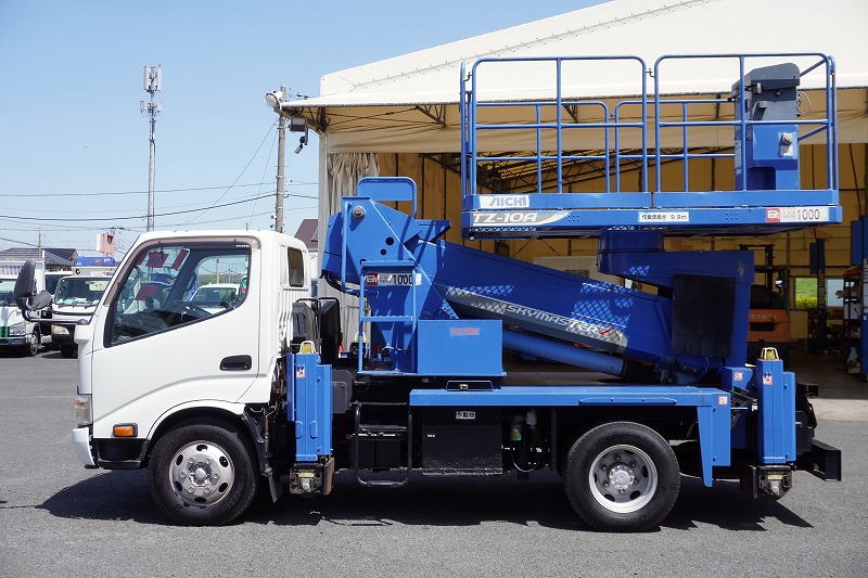 在庫No.K-0249 デュトロ 高所作業車 アイチ製(TZ10A) スーパーデッキ 重荷重型 最大地上高9.9m 鉄製バケット バケット積載荷重1000kg ローラージャッキ ブーム自動格納 アワーメーター:2544h 左電格ミラー 坂道発進補助 ETC 6速MT!