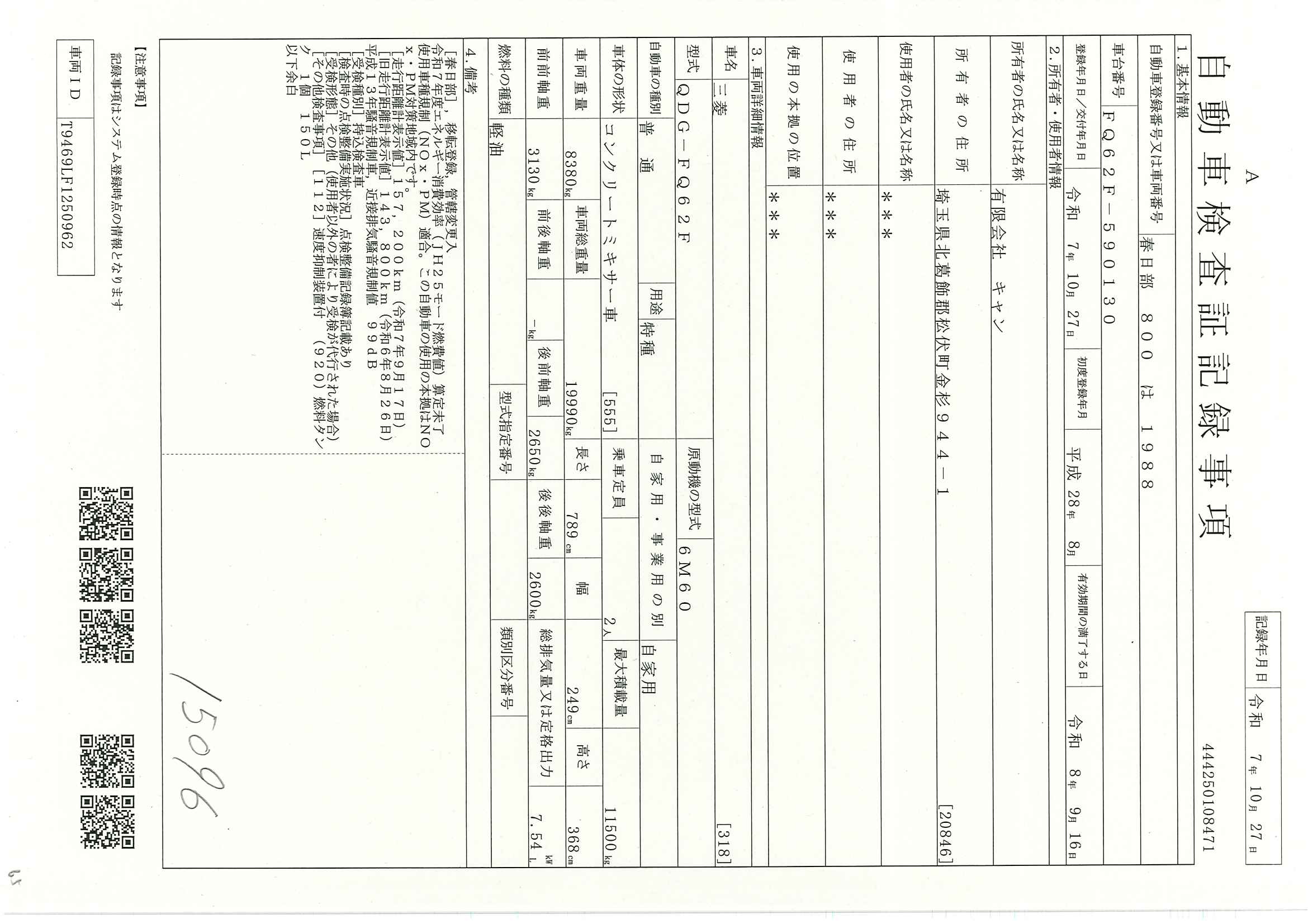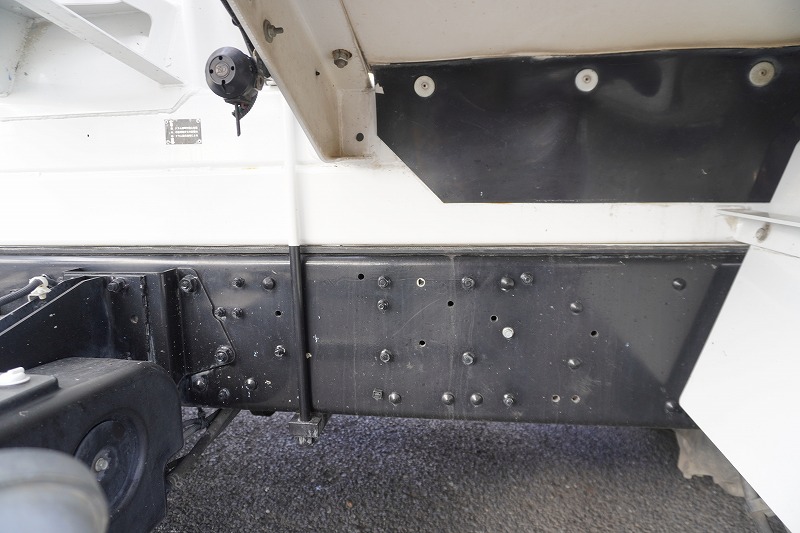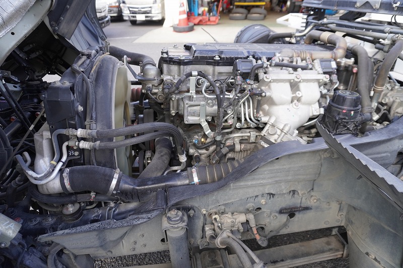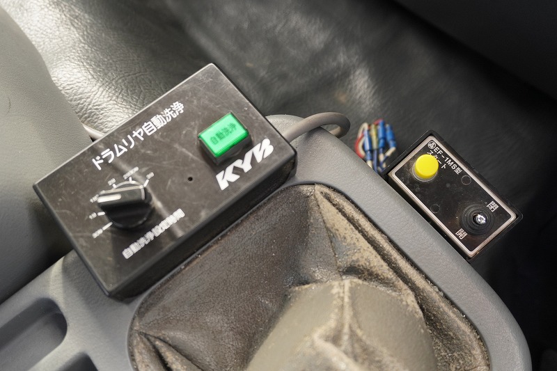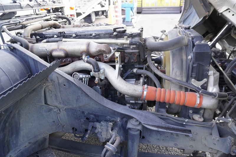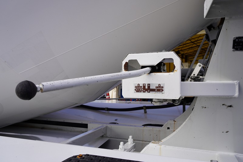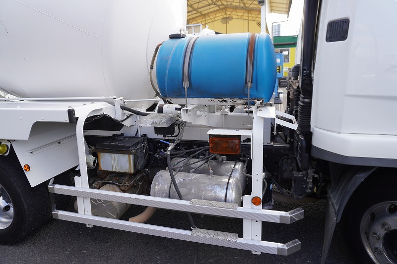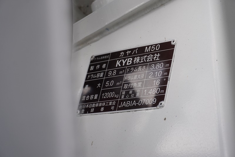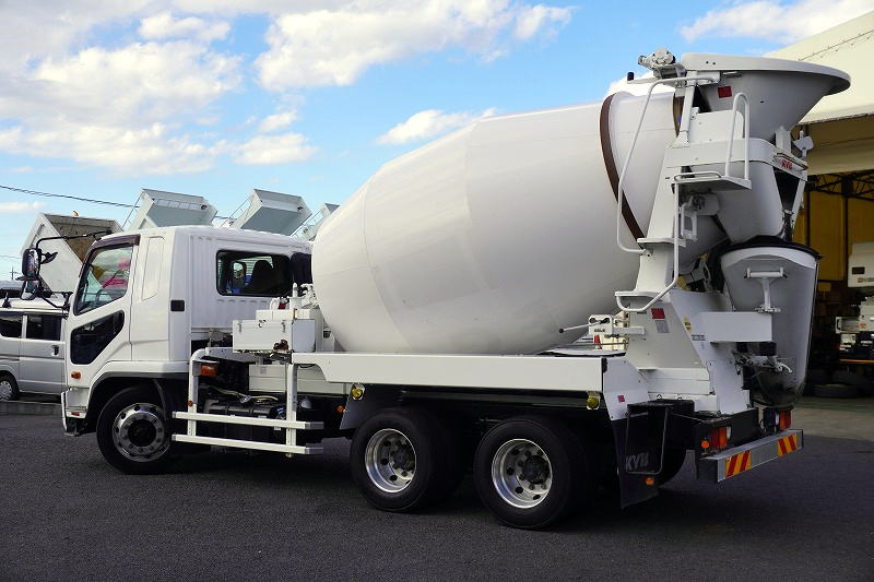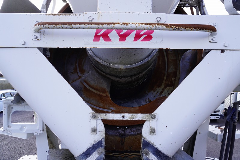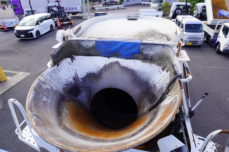 在庫No.K-0096 ファイター 大型 3軸 「ベッド付き」 コンクリートミキサー車 カヤバ製 積載11500kg 電動ホッパーカバー 水タンク 自動洗浄 ドラム容量:9.8立米 混合容量:5.0立米 アルミホイール 坂道発進補助 ミラーヒーター ETC 6速MT! 車検「R8年9月まで!」