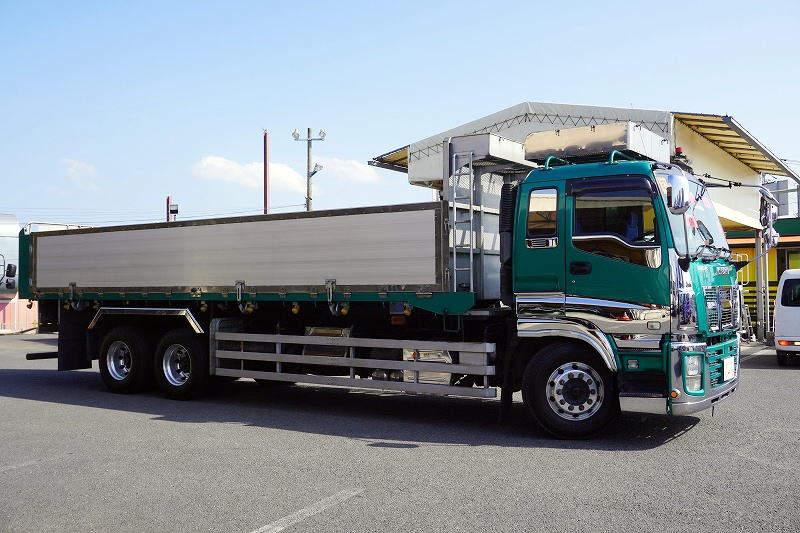 在庫No.U-0527 ギガ 25トン 土砂禁ロング ダンプ 新明和DR14ー01SB 三軸 アルミブロック 三方開 積載12000kg 8.5m長 新明和製 鳥居シートデッキ&ラダー ルーフキャリア セイコーラック バックカメラ ETC アルミホイール メッキパーツ セミAT車!