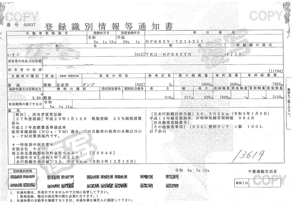 当店が把握できる車検証の表記より