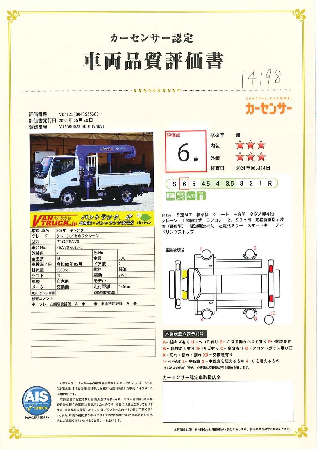 在庫No.C-0198 (未使用) キャンター 「標準幅 ショート」 4段クレーン 積載3000kg タダノ製 ラジコン フックイン 2.53t吊 左電格ミラー 坂道発進補助 LEDヘッドライト スマートキー 衝突軽減ブレーキ 車線逸脱警報 5速MT! 車検「R8年5月まで!」