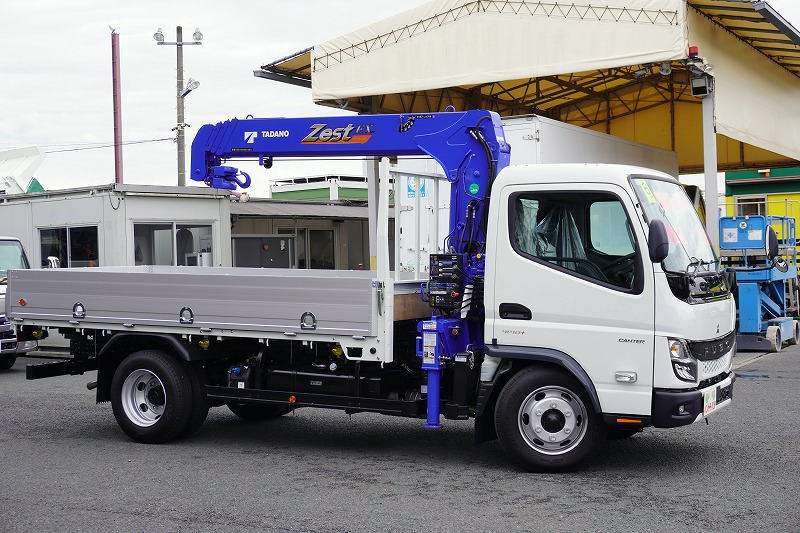 在庫No.C-0735 (未使用) キャンター 「標準幅 ロング」 4段クレーン 積載3000kg アルミブロック タダノ製 ラジコン フックイン 2.63t吊 バックカメラ ロープ穴3対 LEDヘッドライト&フォグランプ 左電格ミラー 衝突軽減ブレーキ 車線逸脱警報 AT車!車検「R8年3月まで!」