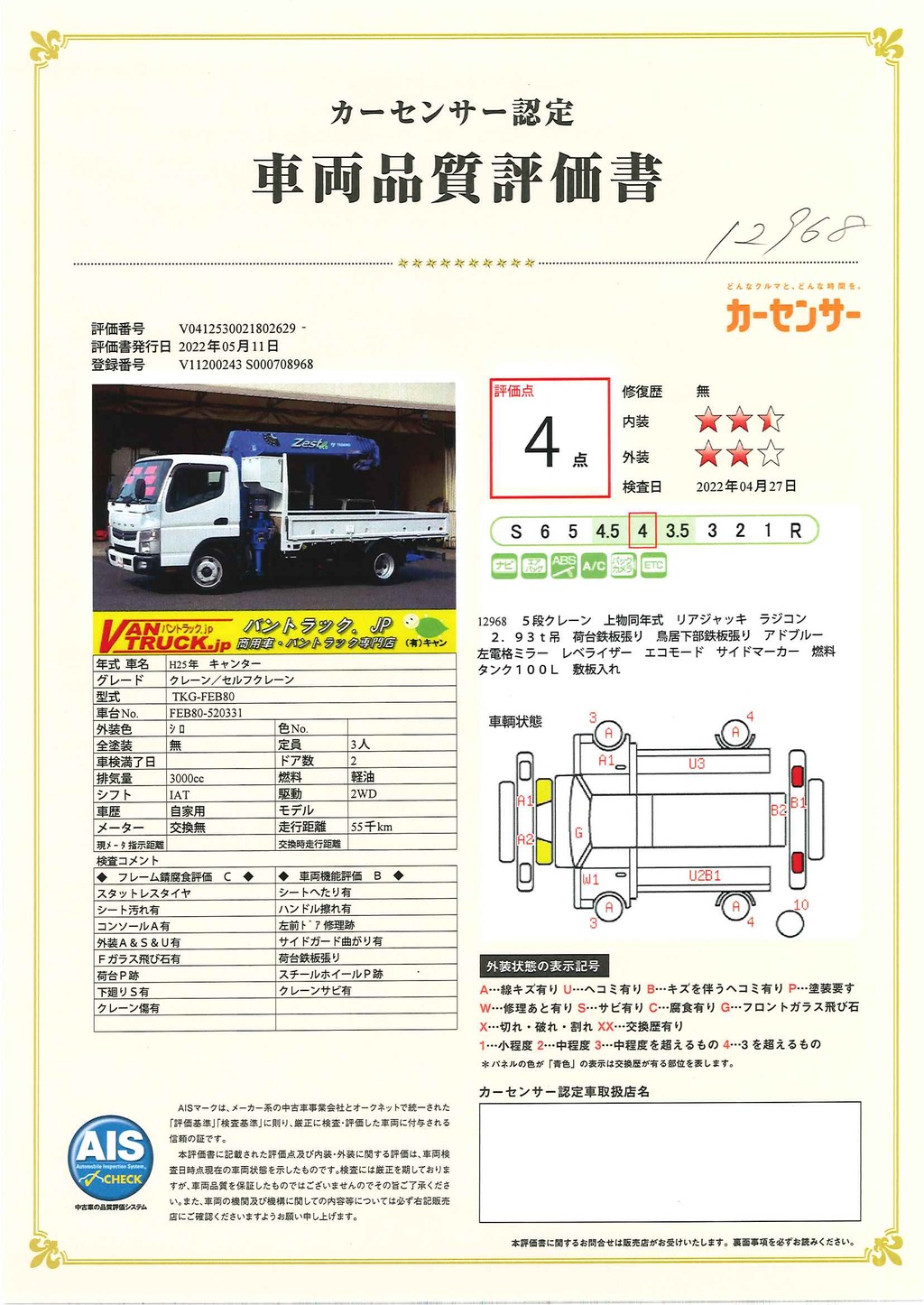 在庫No.R-2968 キャンター 「ワイドロング」 5段クレーン タダノ製 積載2800kg リアジャッキ ラジコン フックイン 2.93t吊 荷台鉄板張り 鳥居工具入れ付き 鳥居下部鉄板張り ロープ穴5対 セイコーラック 社外ナビ ETC バックカメラ 左電格ミラー フォグランプ AT車!