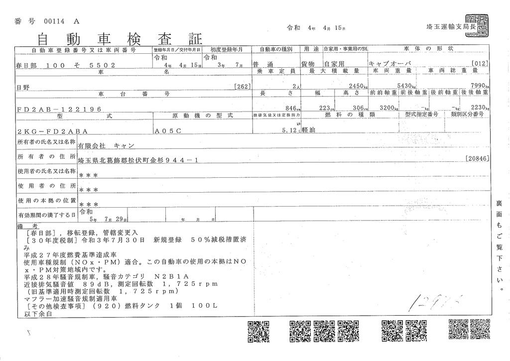 当店が把握できる車検証の表記より