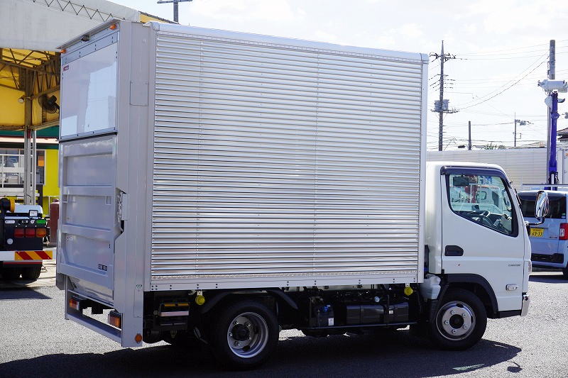 在庫No.U-0677 (未使用) キャンター 10尺 アルミバン サイドドア 「内寸高2.16m」 跳ね上げ式垂直パワーゲート付き 積載1900kg 全低床 ラッシング2段 バックカメラ ETC 左電格ミラー スマートキー LEDヘッドライト&フォグランプ メッキパーツ多数!AT車!準中型(5トン未満限定)免許対応!