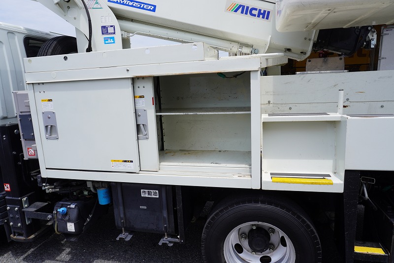 在庫No.C-0289 キャンター 高所作業車 アイチ製(SB10A) 最大地上高9.7m FRPバケット バケット積載荷重200kg 積載250kg 工具入れ ジョイスティックタイプ アワーメーター:2425h 左電格ミラー 社外ナビ ワンセグTV バックカメラ ETC フォグランプ 通信工事仕様!AT車!