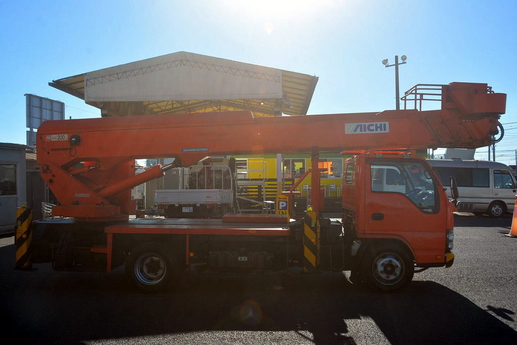 在庫No.R-2703 エルフ 高所作業車 アイチ製(SK22A) 最大地上高22.1m 鉄製バケット バケット積載荷重200kg アワーメーター:5865h ブーム自動格納付き 坂道発進補助 左電格ミラー 6速MT!