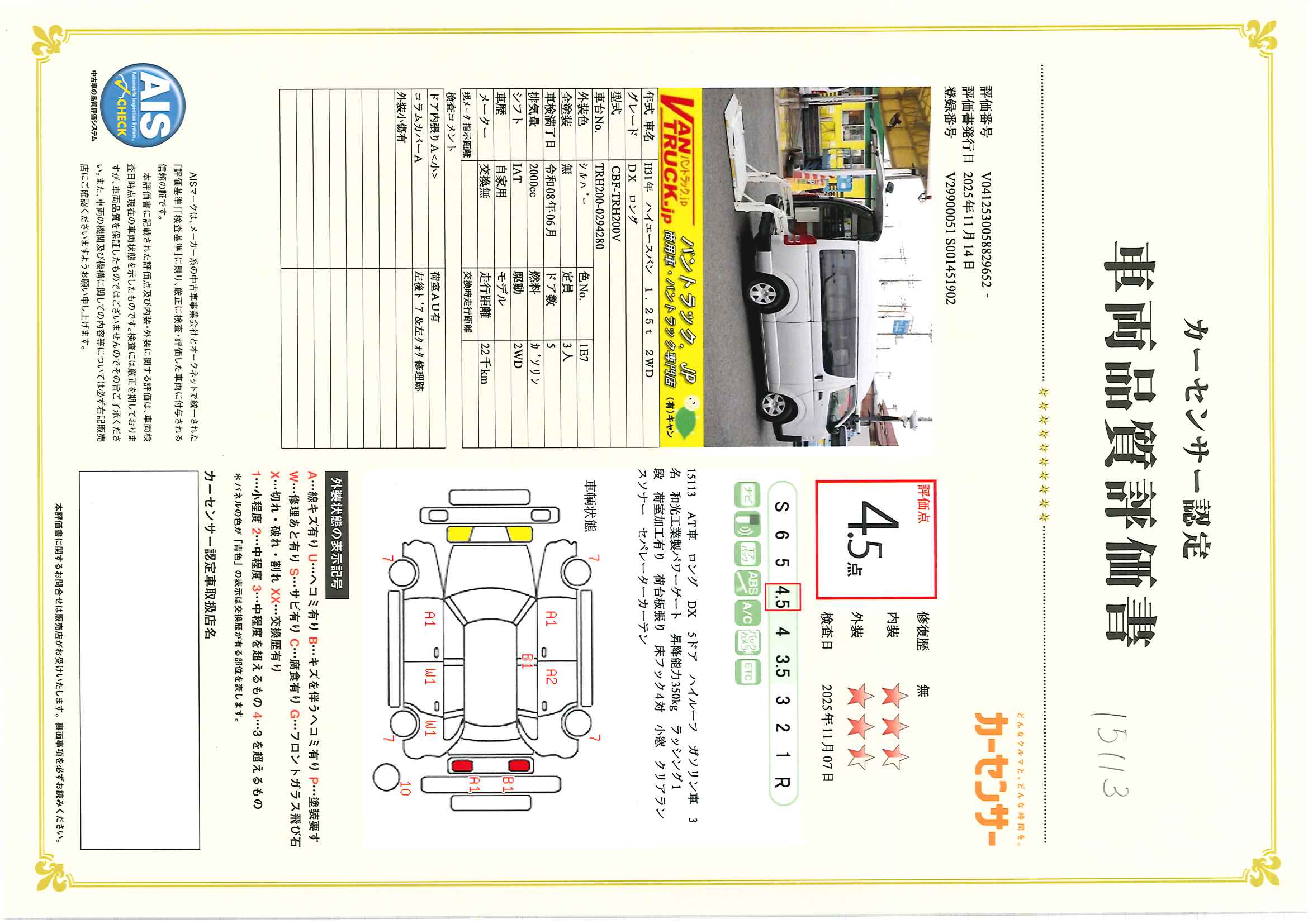 在庫No.K-0113 ハイエース ロング DX 5ドア 「ハイルーフ」 ガソリン車 3人乗り 和光工業製パワーゲート ラッシング1段 荷室加工有り 荷台板張り 床フック4対 クリアランスソナー バックカメラ ETC 社外ナビ セパレーターカーテン 低走行!AT車! 車検「R8年6月まで!」