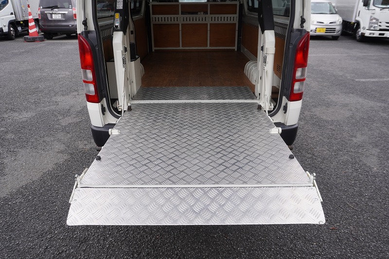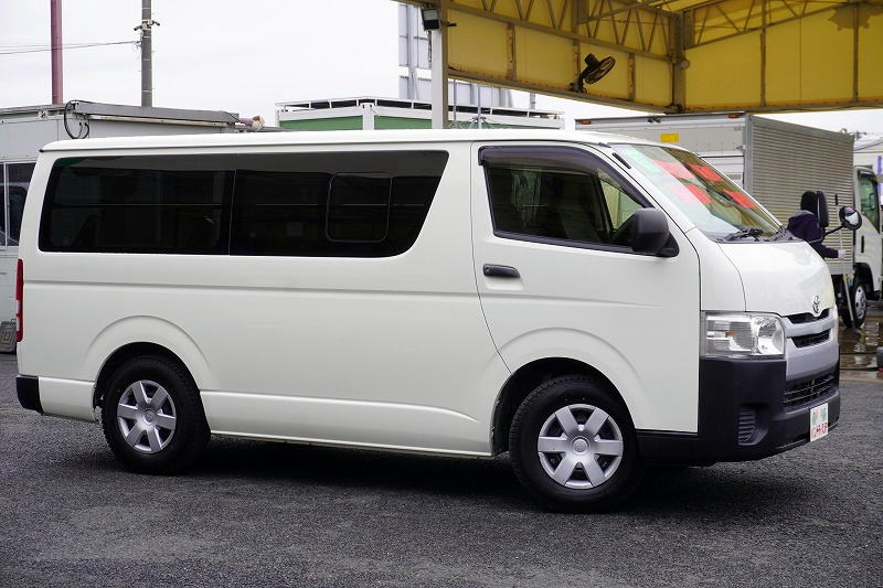 在庫No.K-0297 ハイエース ロング DX 4ドア ガソリン車 3人乗り トヨタ車体製パワーゲート 荷室加工有り 荷台板張り ラッシング1段 小窓 バックカメラ 社外ナビ ETC キーレス 低走行!AT車! AK