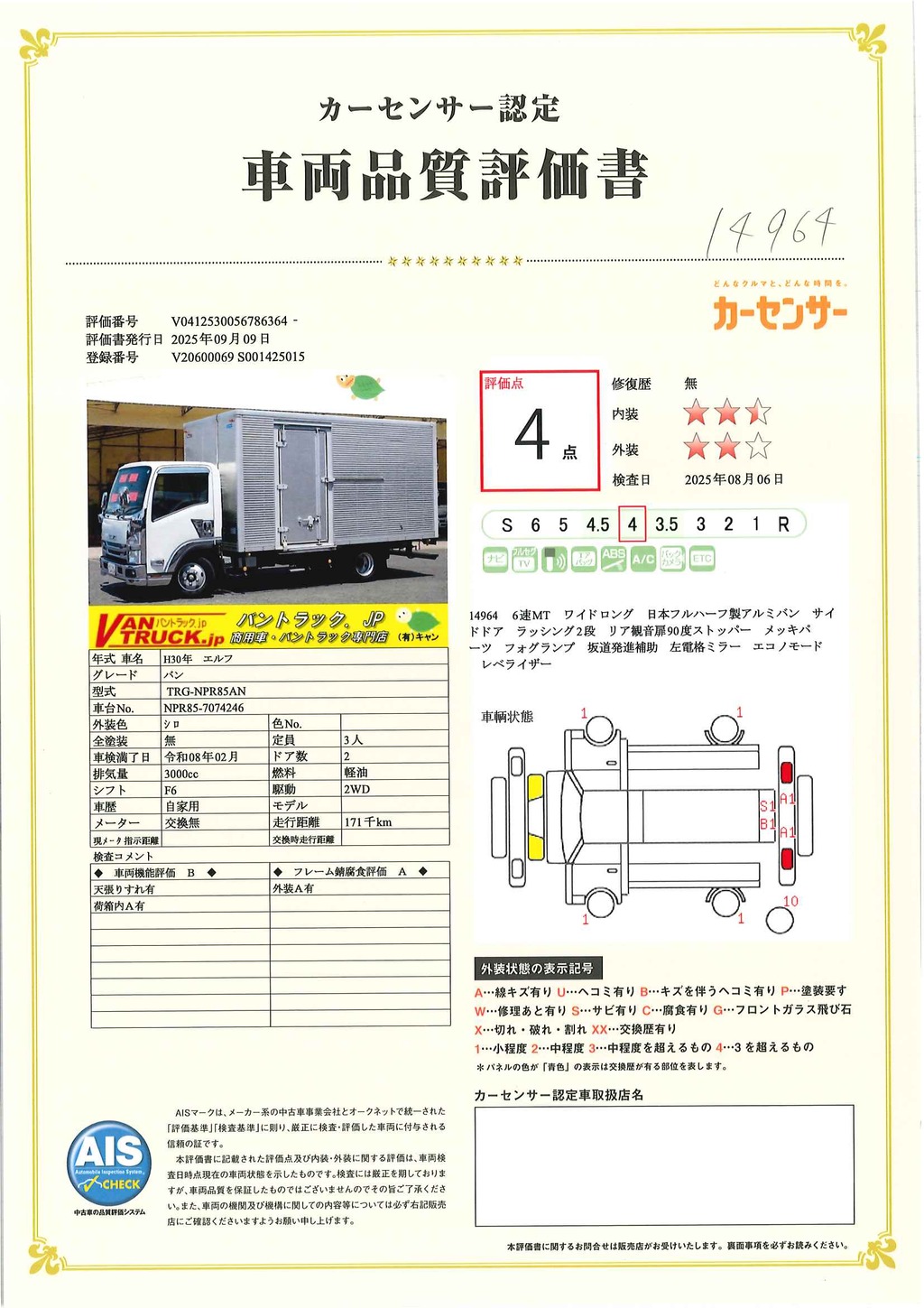 在庫No.C-0964 エルフ 「ワイドロング」 アルミバン 積載2000kg サイドドア ラッシング2段 バックカメラ 社外ナビ フルセグTV ETC メッキパーツ 坂道発進補助 左電格ミラー キーレス フォグランプ 日本フルハーフ製 ワンオーナー!6速MT! 車検「R8年2月まで!」
