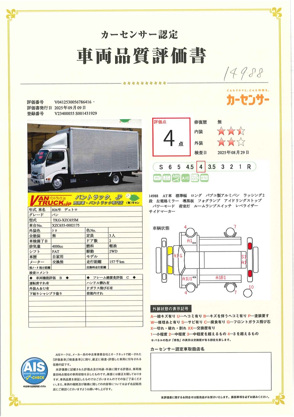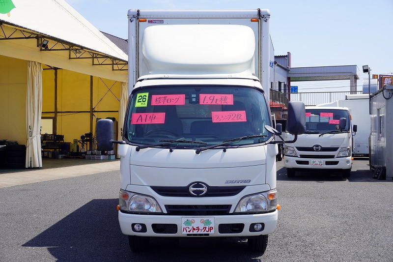 在庫No.C-0988 デュトロ 「標準幅 ロング」 アルミバン 積載1900kg ラッシング2段 左電格ミラー バックカメラ 社外ナビ ETC 導風板 フォグランプ パブコ製 AT車!