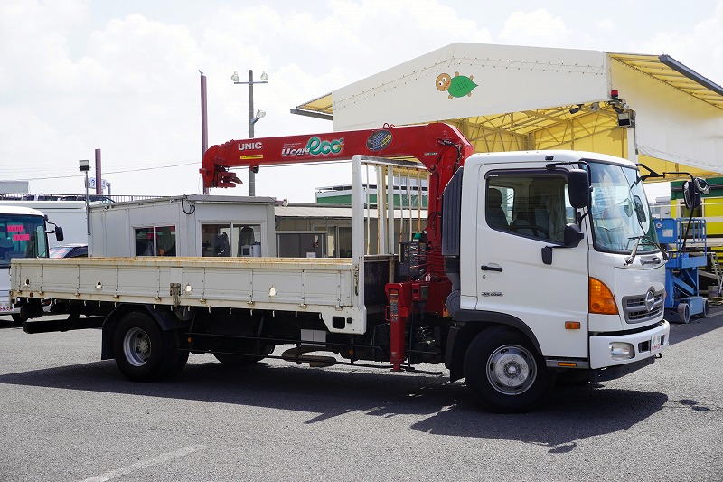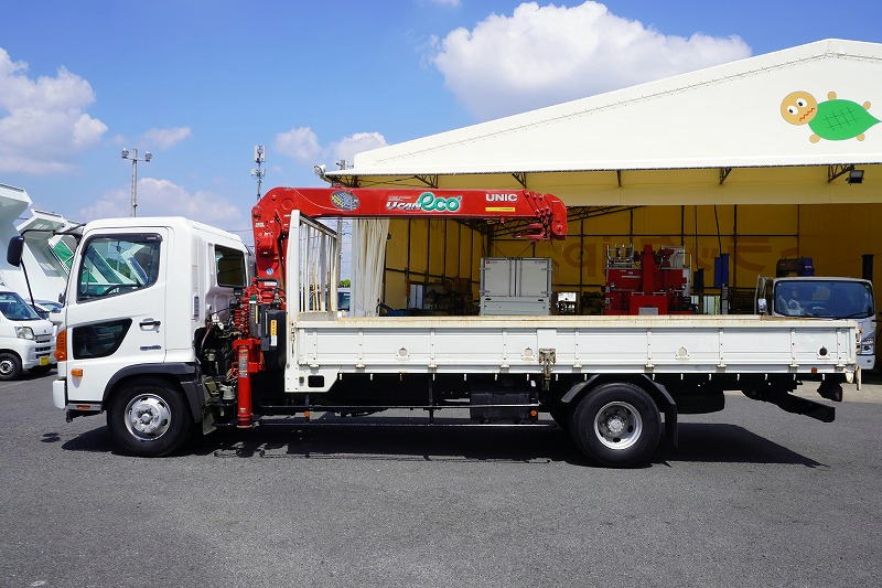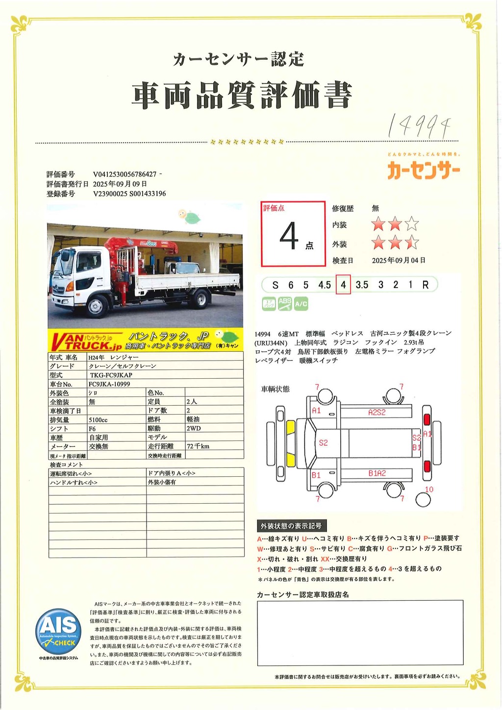 在庫No.C-0994 レンジャー 4トン 「標準幅 ベッドレス」 4段クレーン 積載2650kg 古河ユニック製 5.4m長 ラジコン フックイン 2.93t吊 ロープ穴4対 鳥居下部鉄板張り 6速MT!