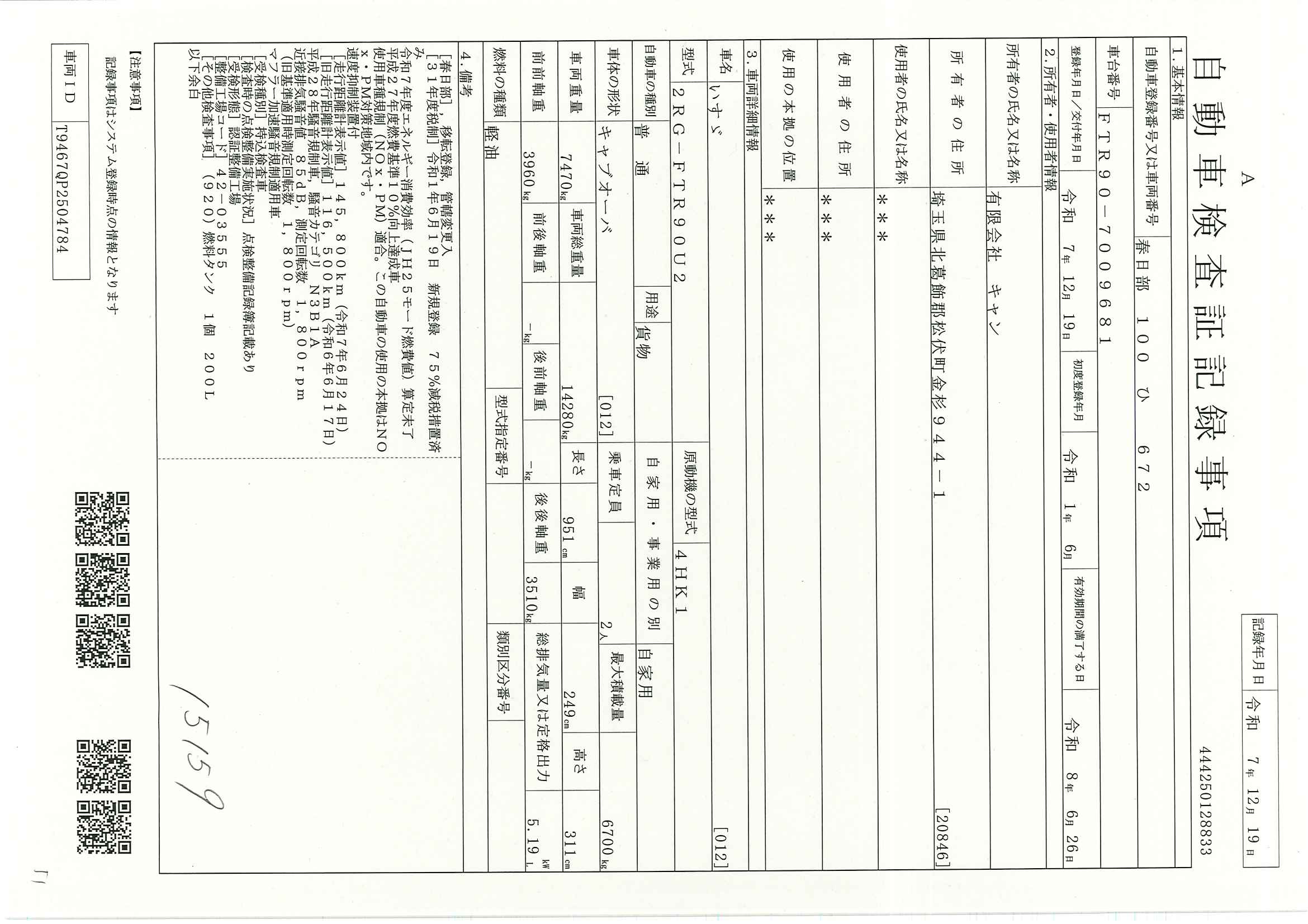 当店が把握できる車検証の表記より