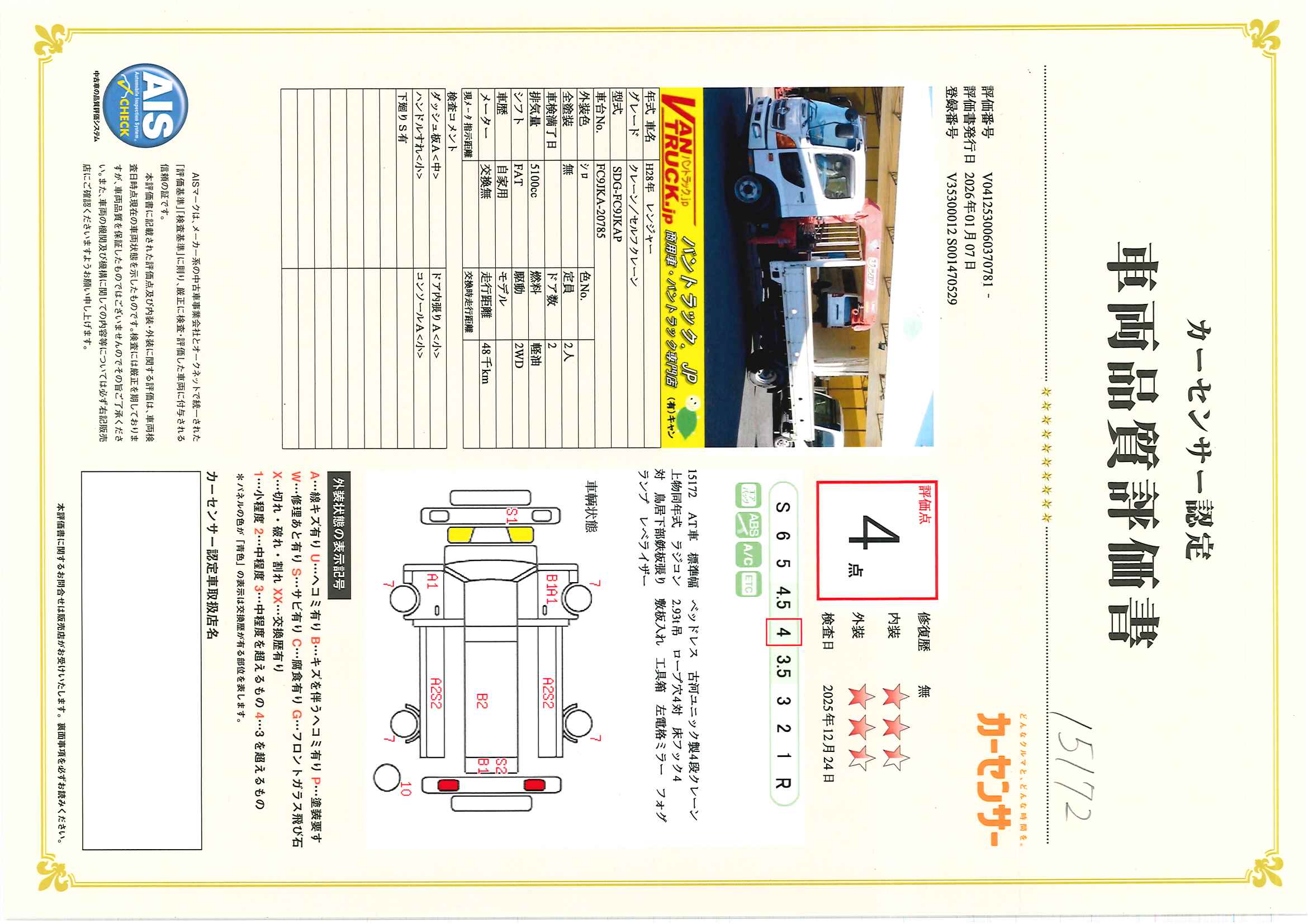 在庫No.K-0172 レンジャー 4トン 「標準幅 ベッドレス」 4段クレーン 積載2600kg 古河ユニック製 5.4m長 ラジコン フックイン 2.93t吊 鳥居下部鉄板張り ロープ穴4対 床フック4対 ETC AT車!