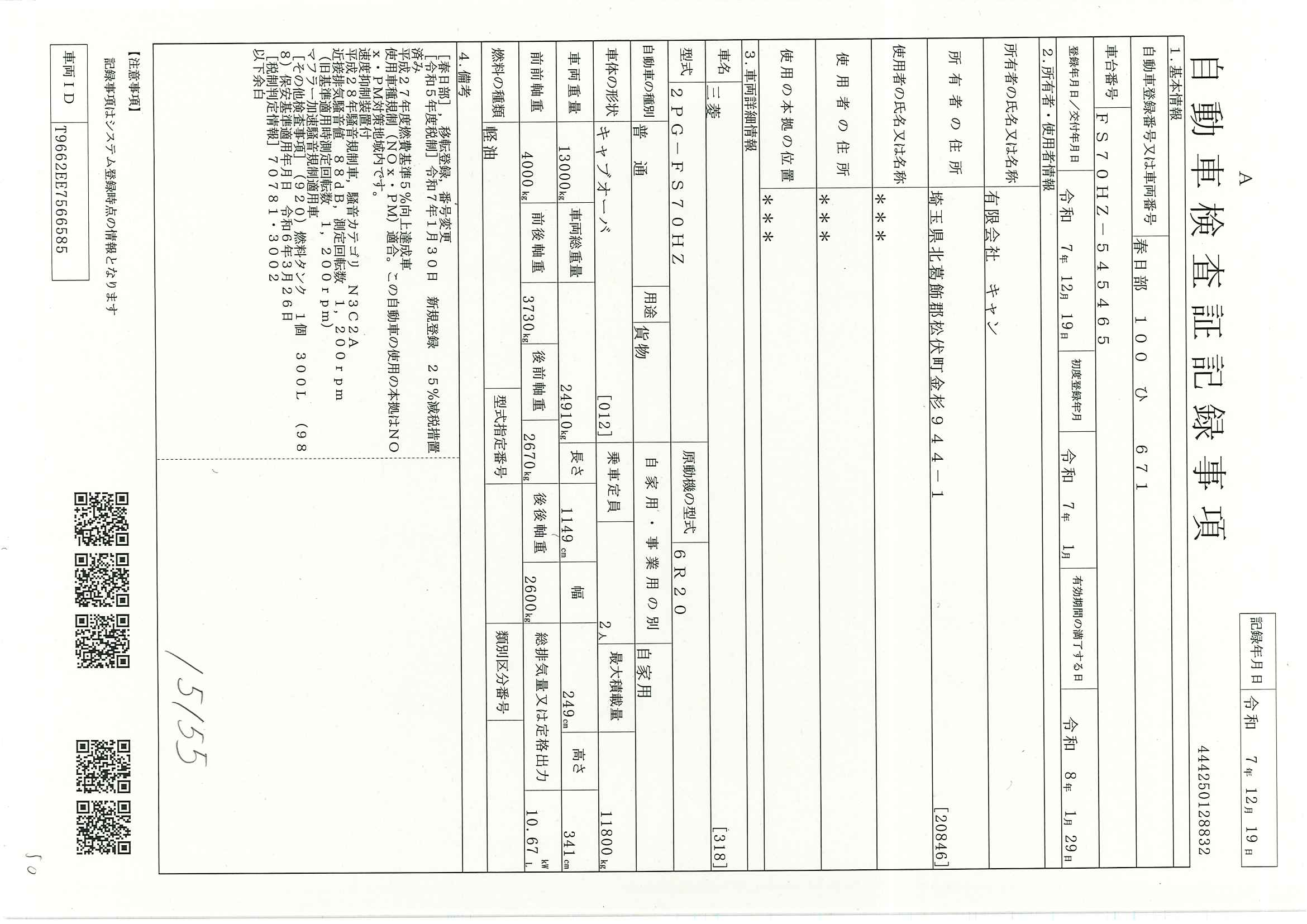 当店が把握できる車検証の表記より