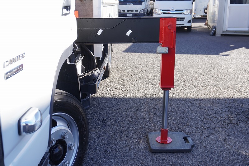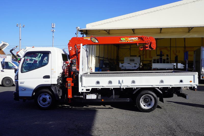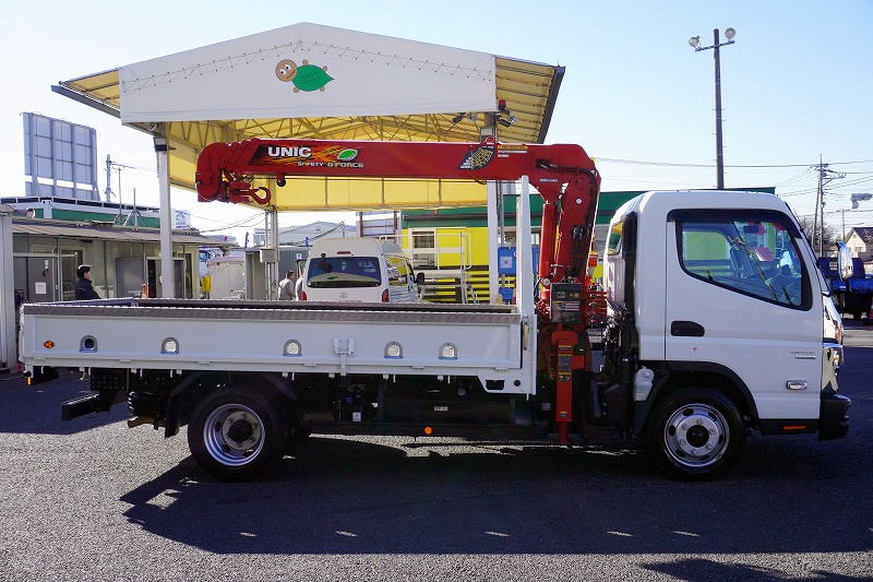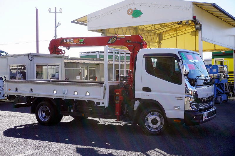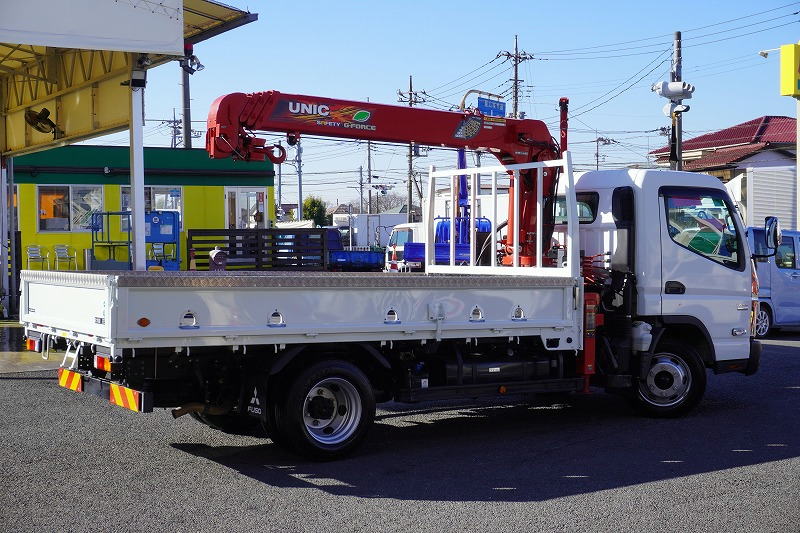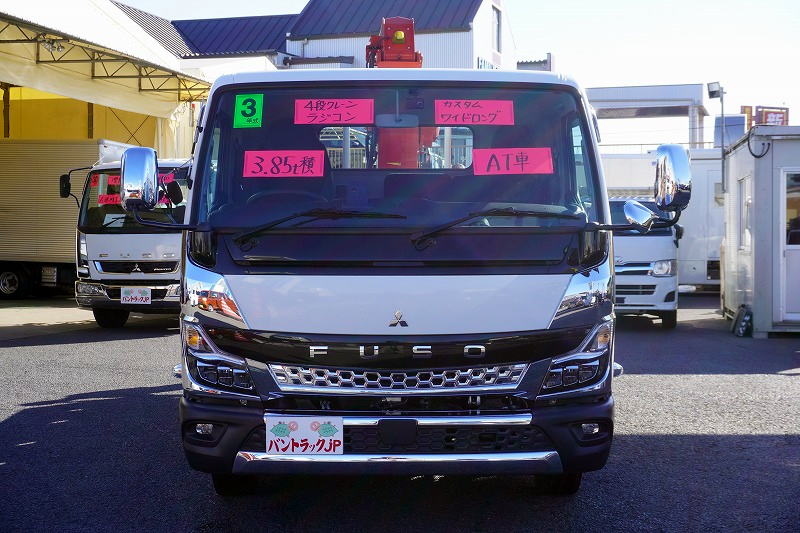 在庫No.K-0185 キャンター 「カスタム ワイドロング」 4段クレーン 積載3850kg 古河ユニック製 ラジコン フックイン 2.93t吊 セイコーラック アオリプロテクター付き LEDヘッドライト&フォグランプ 左電格ミラー オートエアコン 社外ナビ ETC2.0 メッキパーツ スマートキー 衝突軽減ブレーキ 車線逸脱警報 低走行!AT車!