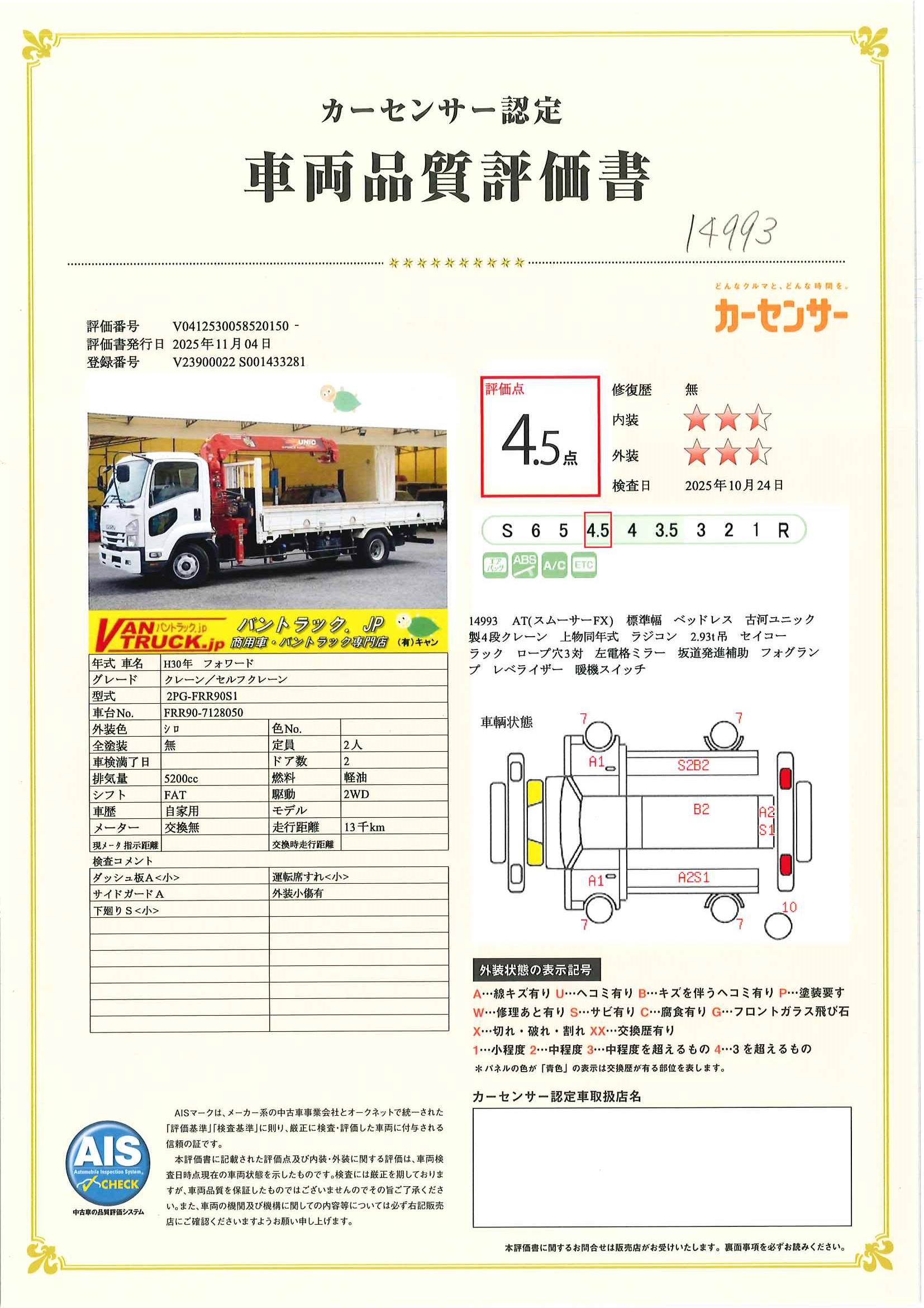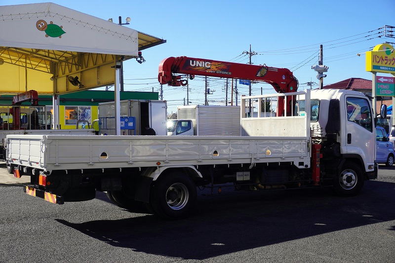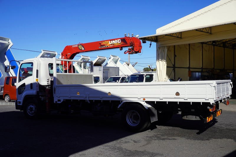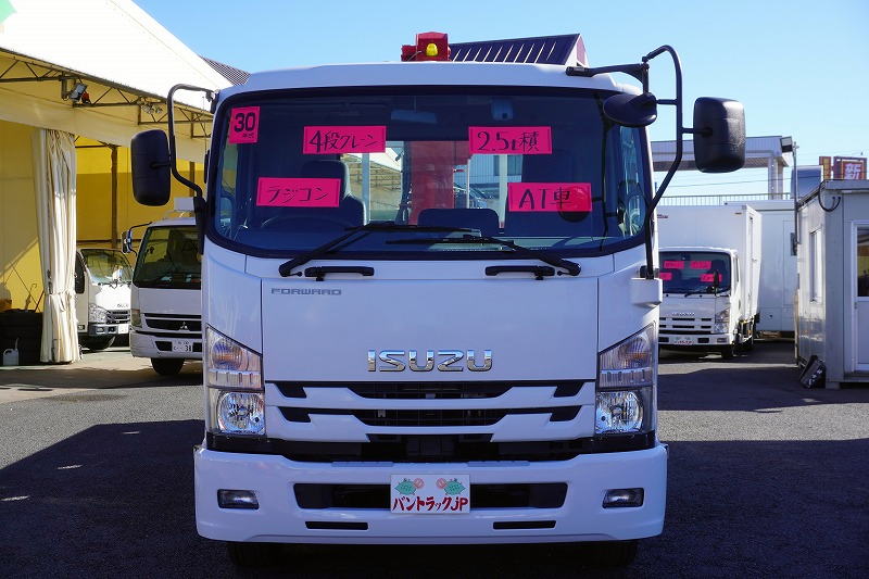 在庫No.C-0993 フォワード 4トン 「標準幅 ベッドレス」 4段クレーン 積載2500kg 古河ユニック製 5.4m長 ラジコン フックイン 2.93t吊 セイコーラック ロープ穴3対 ETC 低走行!AT車!