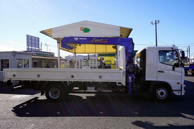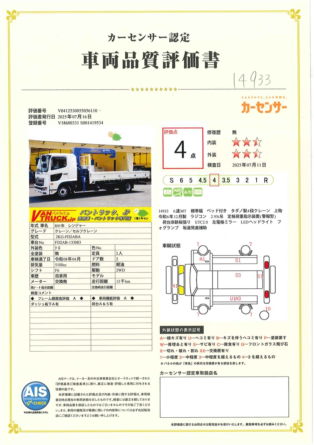 在庫No.C-0933 レンジャー 4トン 「標準幅 ベッド付き」 4段クレーン 積載2100kg タダノ製 5.1m長 ラジコン フックイン 2.93t吊 セイコーラック ロープ穴4対 LEDヘッドライト&フォグランプ 坂道発進補助 オートエアコン ETC2.0 衝突軽減ブレーキ 車線逸脱警報 6速MT!高年式!低走行!! 車検「R8年4月まで!」