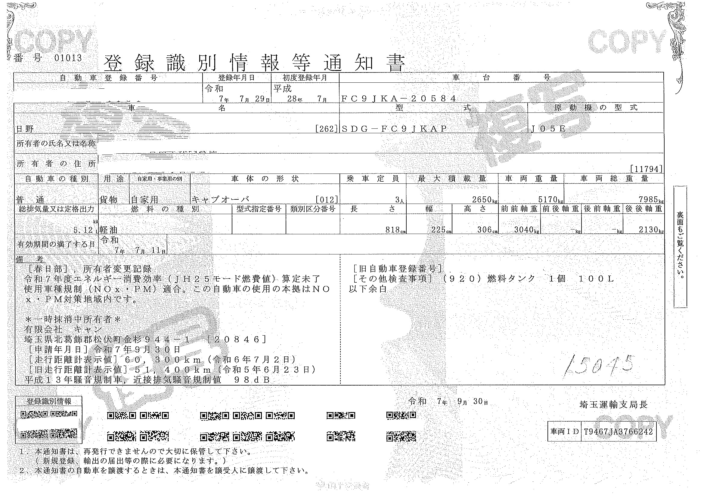当店が把握できる車検証の表記より