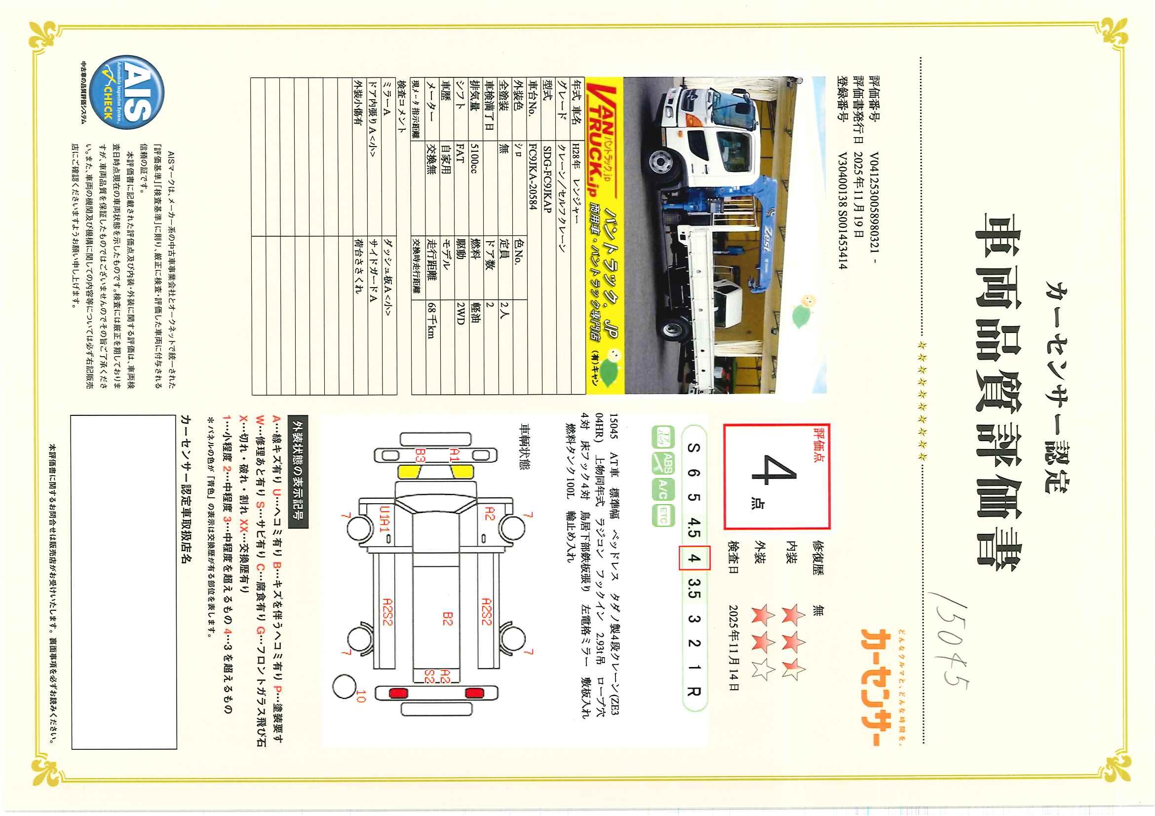 在庫No.K-0045 レンジャー 4トン 「標準幅 ベッドレス」 4段クレーン 積載2650kg タダノ製 5.4m長 ラジコン フックイン 2.93t吊 ロープ穴4対 床フック4対 鳥居下部鉄板張り ETC AT車!
