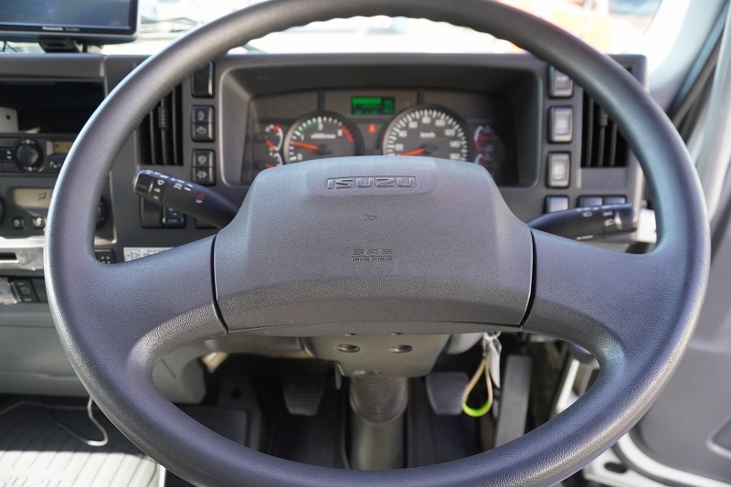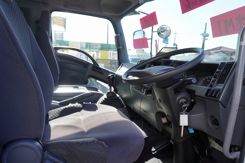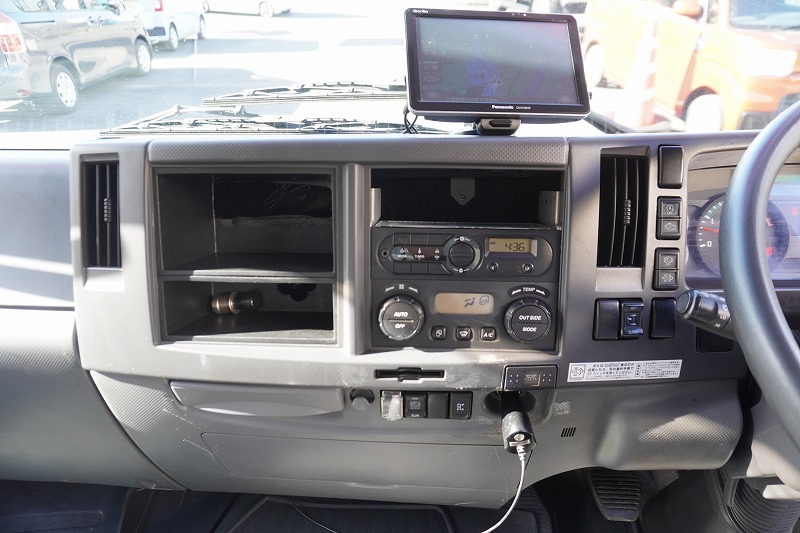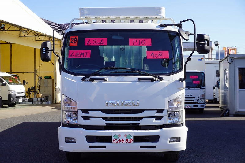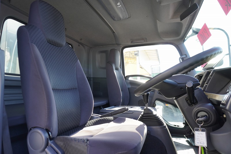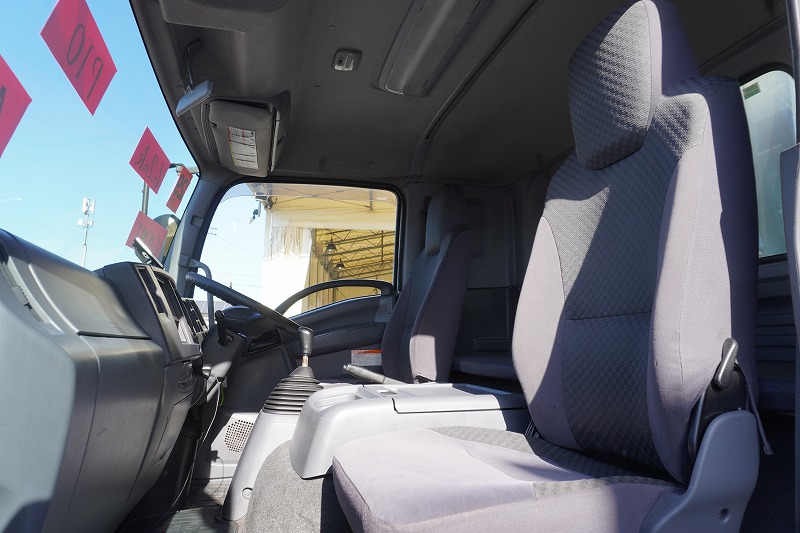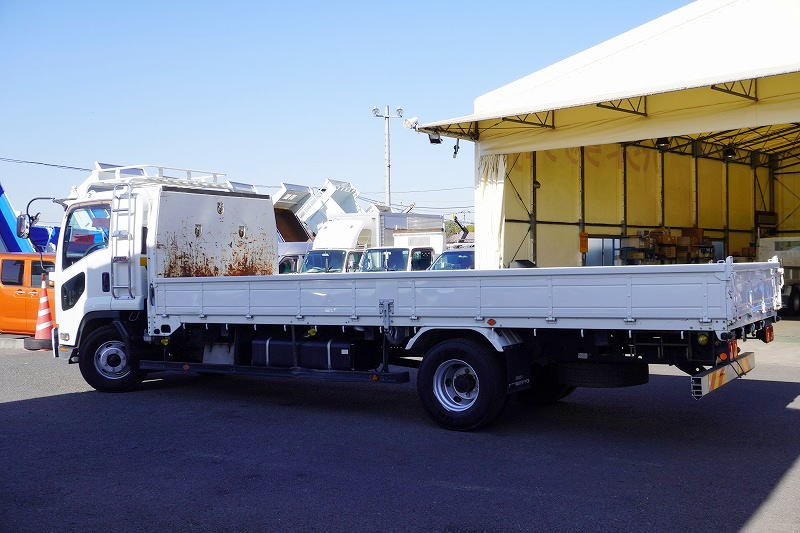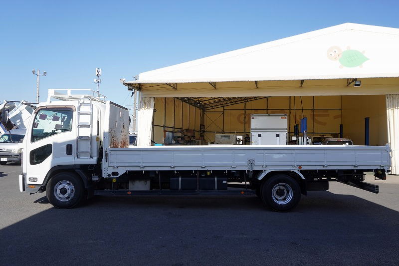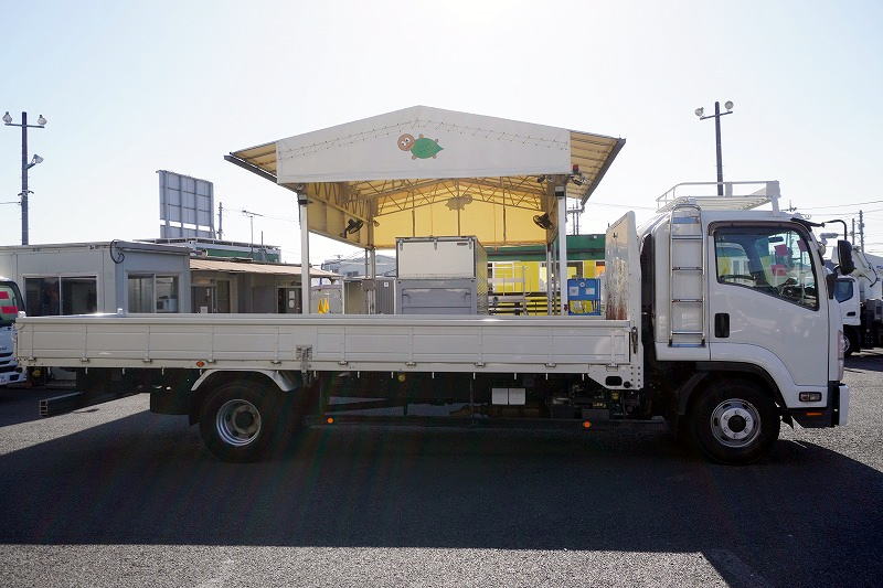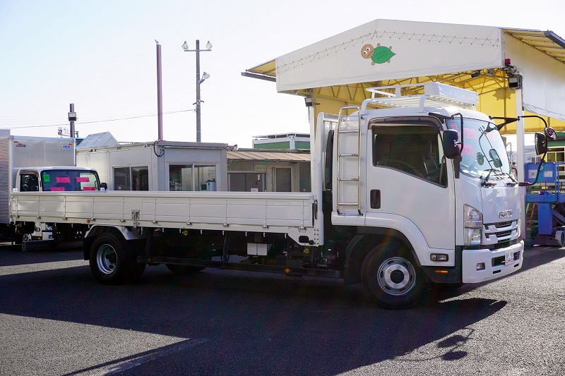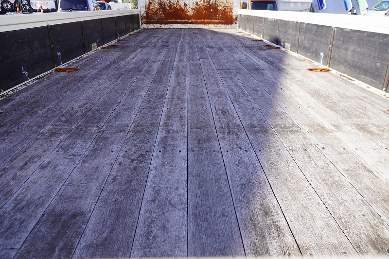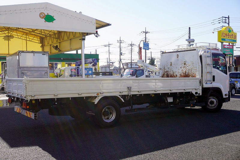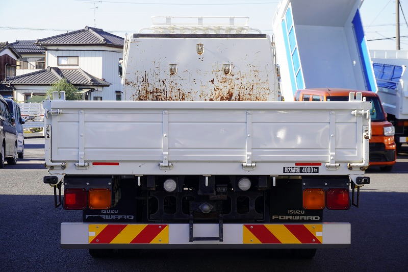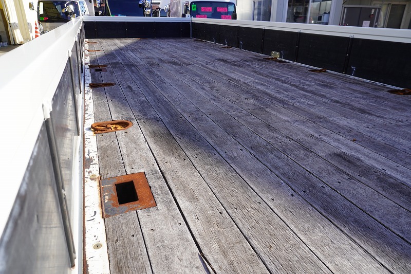 在庫No.K-0171 フォワード 4トン 「標準幅 ベッド付き」 平ボディー 積載4000kg リーフサス 6.2m長 鳥居鉄板張り&フック付 セイコーラック スタンション穴 ルーフキャリア キャブラダー 床フック5対 坂道発進補助 オートエアコン PTO付き バックカメラ ポータブルナビ ワンセグTV 6速MT!
