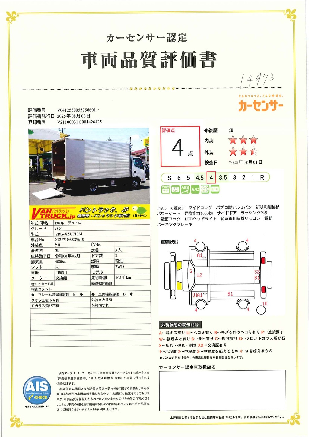 在庫No.C-0973 デュトロ 「ワイドロング」 アルミバン 積載2000kg 格納パワーゲート サイドドア ラッシング2段 壁面フック バックカメラ 社外ナビ ETC LEDヘッドライト 左電格ミラー 90度ストッパー 電動パーキングブレーキ クリアランスソナー 衝突軽減ブレーキ 車線逸脱警報 6速MT! 車検「R8年3月まで!」