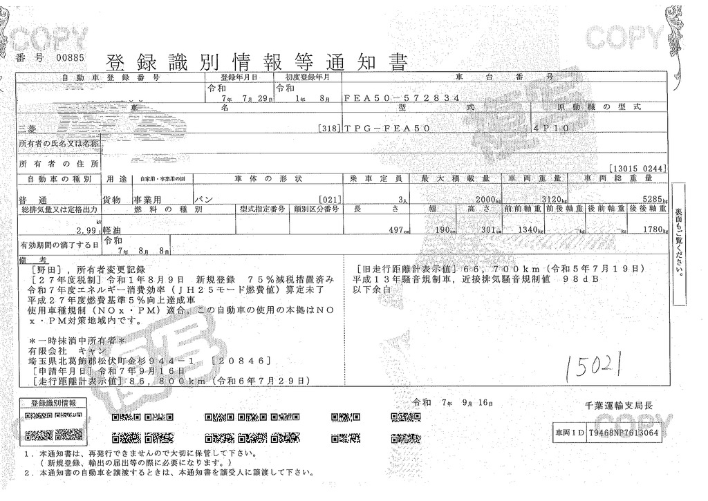 当店が把握できる車検証の表記より