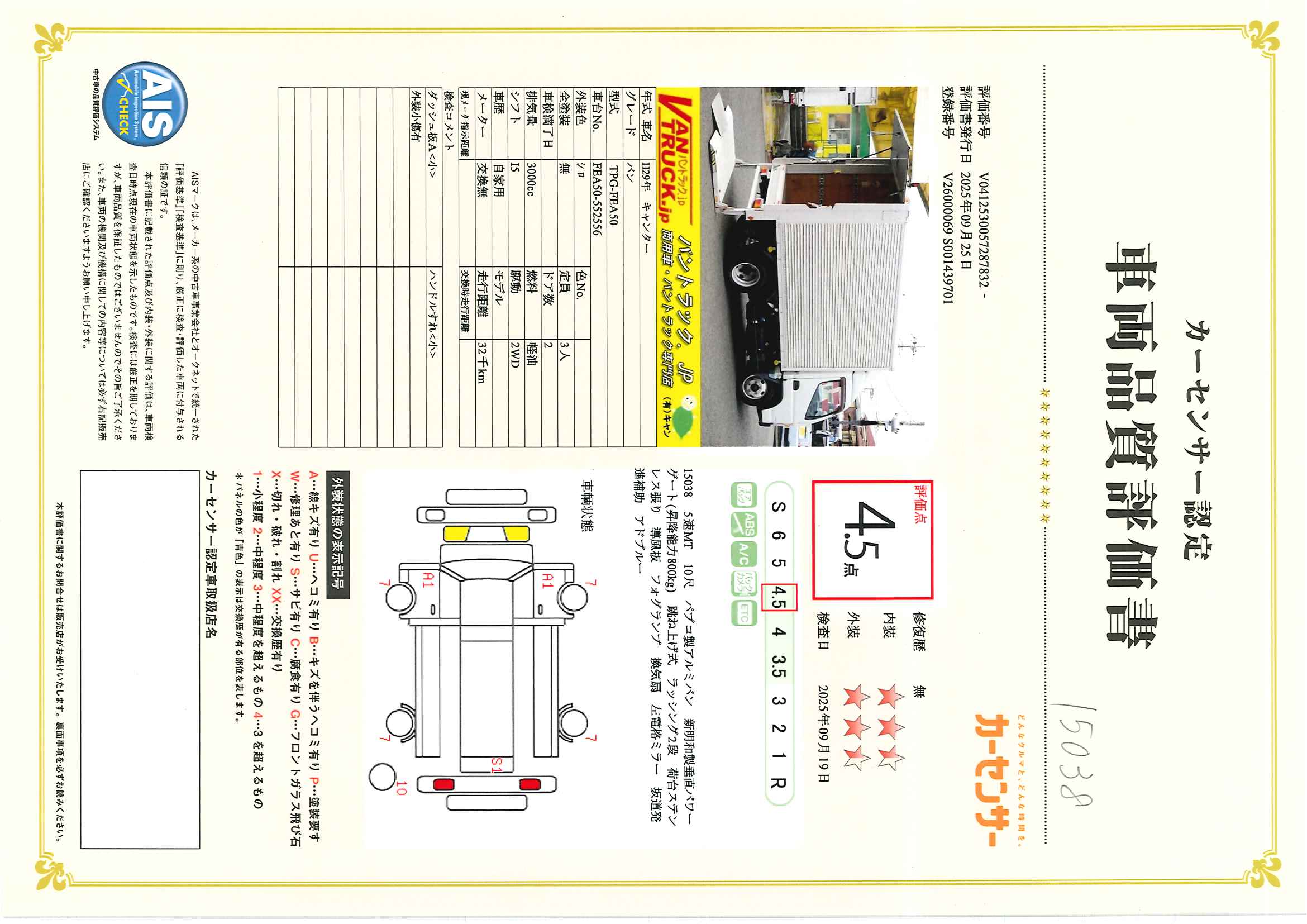 在庫No.K-0038 キャンター 10尺 アルミバン 積載2000kg 跳ね上げ式 垂直パワーゲート ラッシング2段 荷台ステンレス張り 導風板 換気扇 バックカメラ ETC フォグランプ 5速MT!