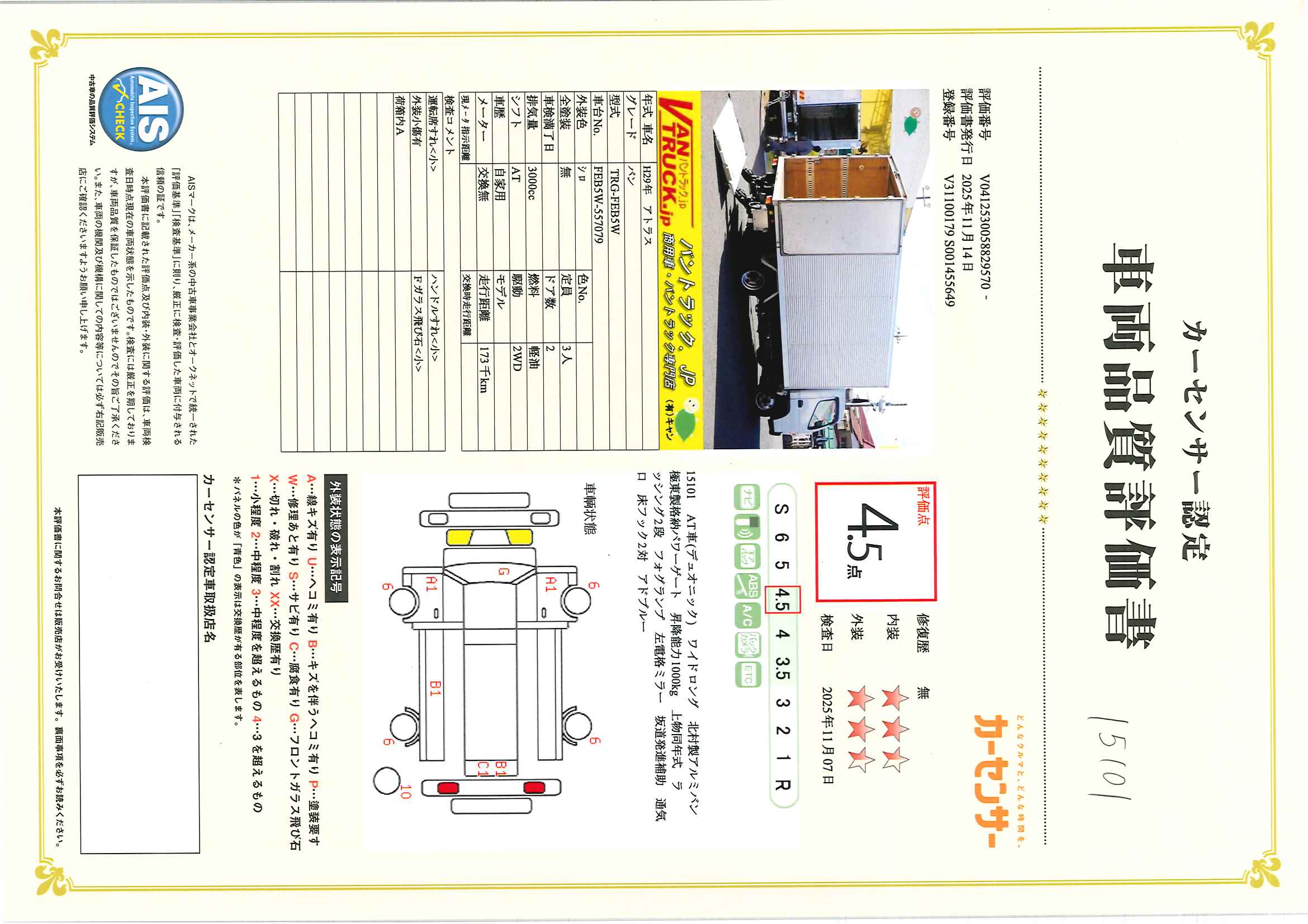 在庫No.K-0101 アトラス 「ワイドロング」 アルミバン 積載2000kg サイドドア 格納パワーゲート ラッシング2段 床フック2対 通気口 バックカメラ ETC 社外ナビ 左電格ミラー フォグランプ 北村製 AT車!