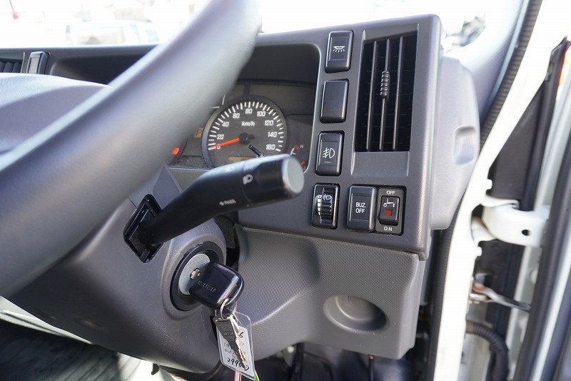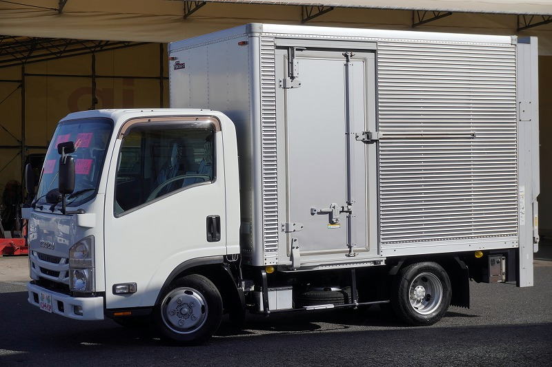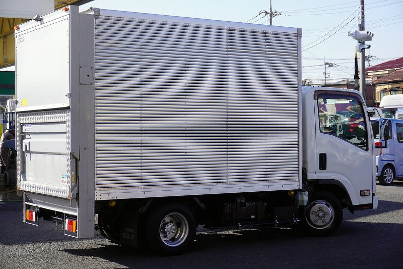 在庫No.K-0246 エルフ 10尺 アルミバン 積載1850kg 跳ね上げ式 垂直パワーゲート サイドドア ラッシング2段 左電格ミラー バックカメラ 社外ナビ ETC フォグランプ 全低床 AT車!準中型(5トン限定)免許対応!
