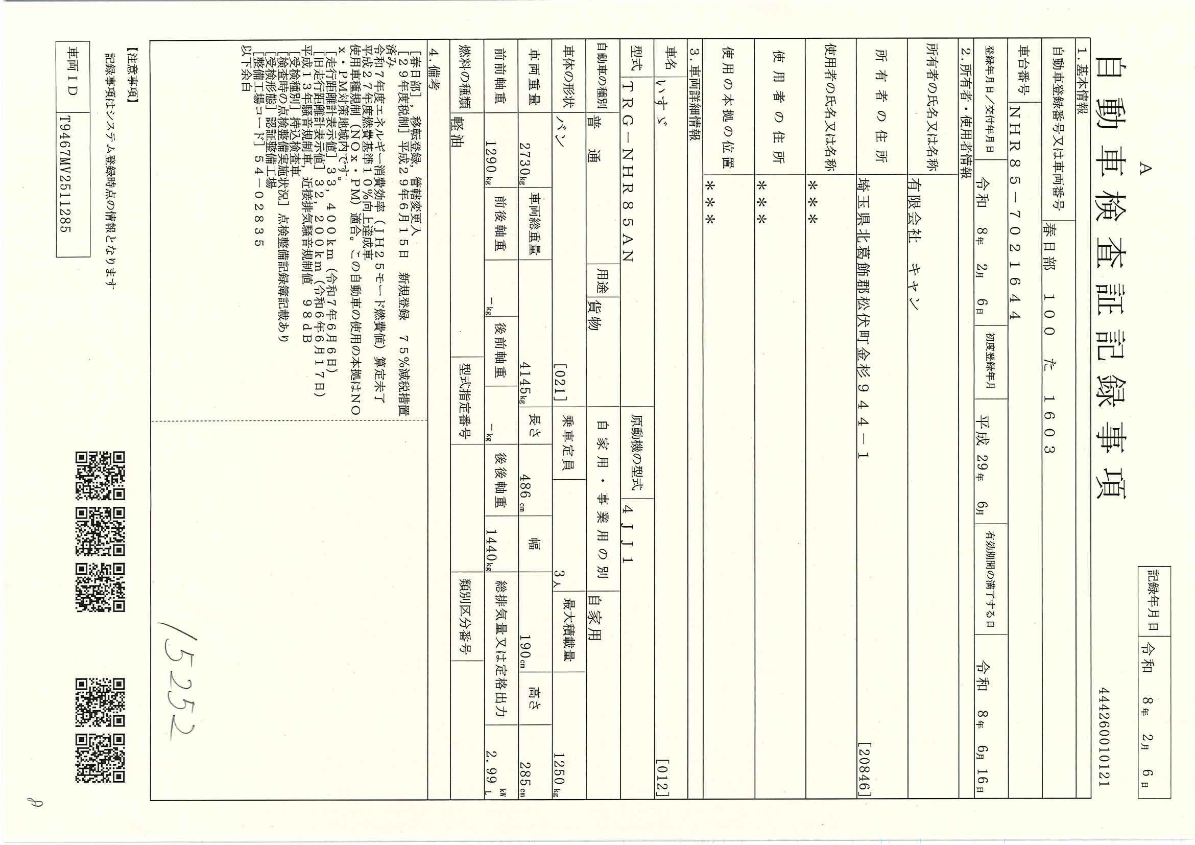 当店が把握できる車検証の表記より