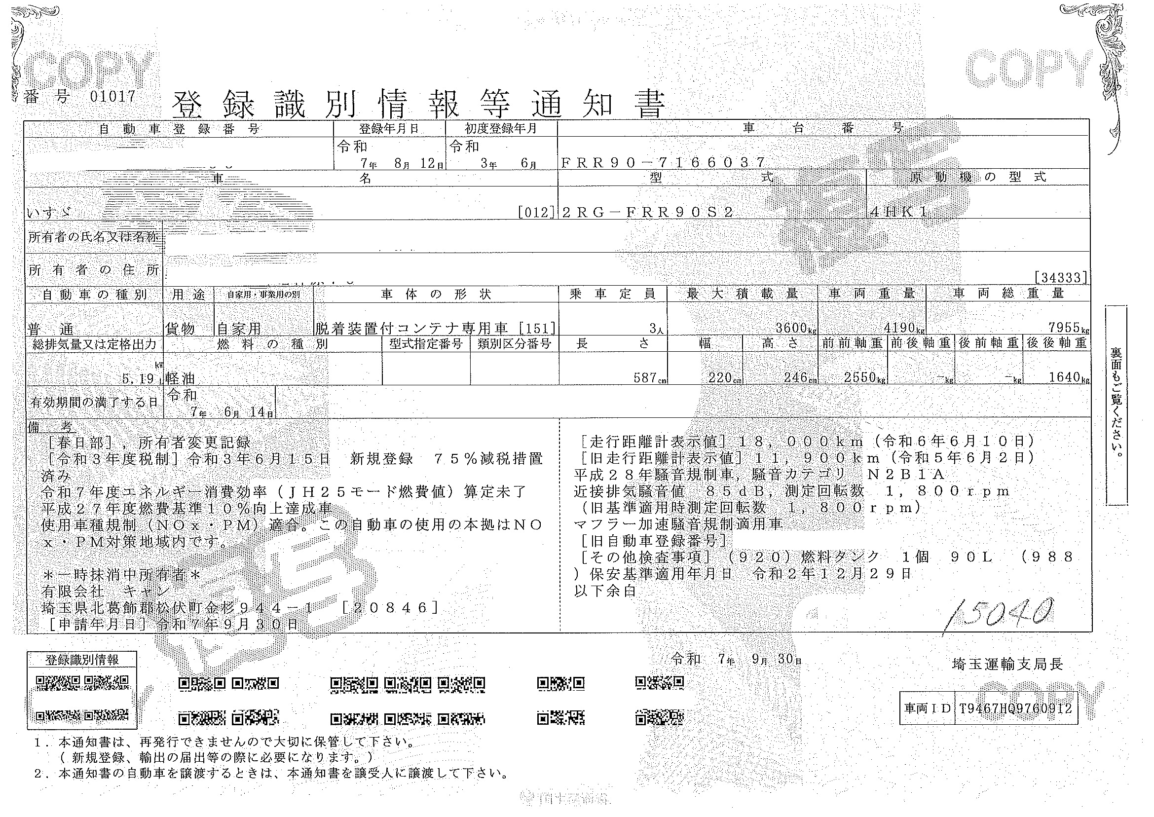 当店が把握できる車検証の表記より