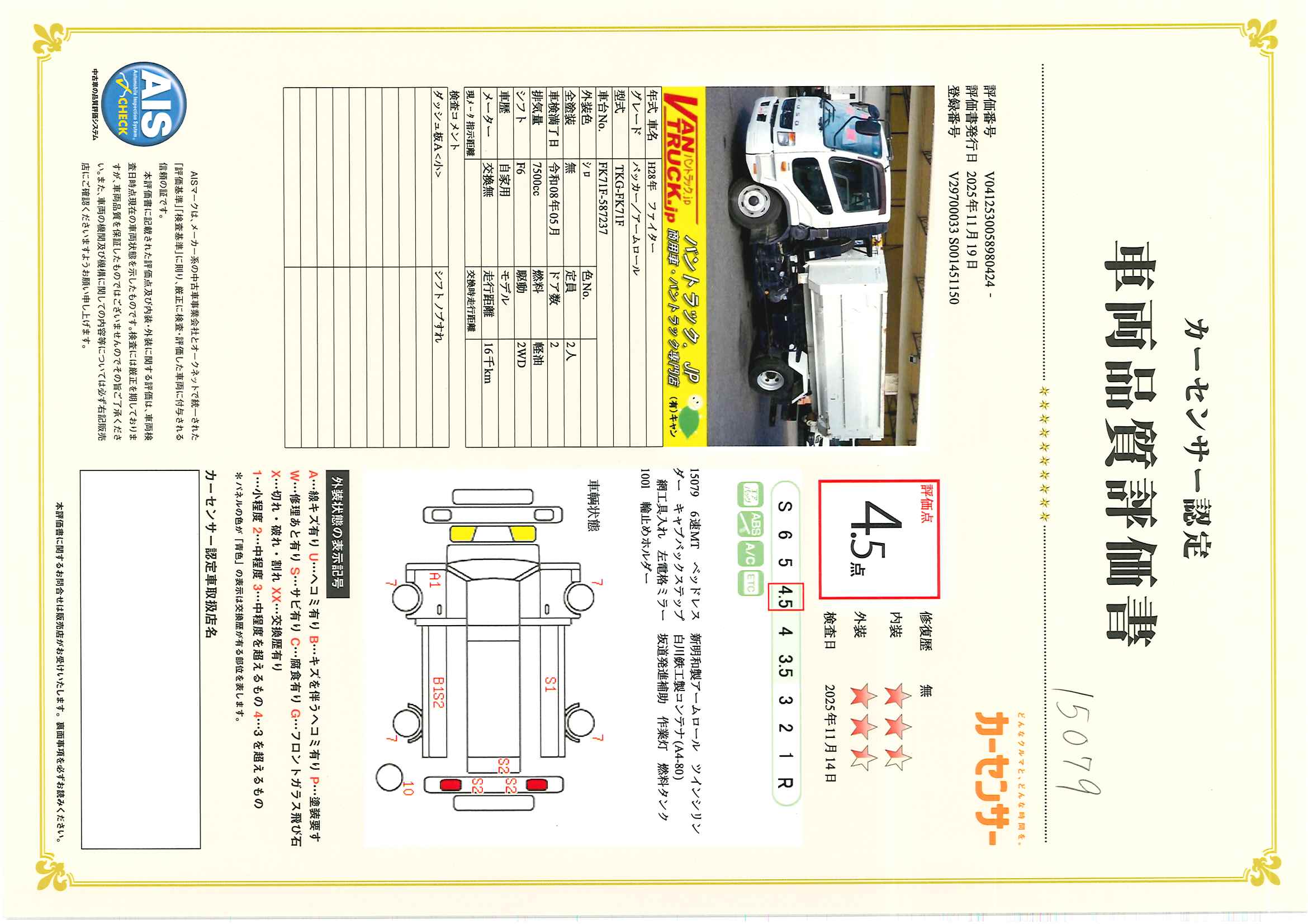 在庫No.K-0079 ファイター 4トン 「ベッドレス」 アームロール 新明和製 積載3650kg ツインシリンダー キャブバックステップ コンテナ付き 網工具入れ 坂道発進補助 ETC 低走行!6速MT! 車検「R8年5月まで!」