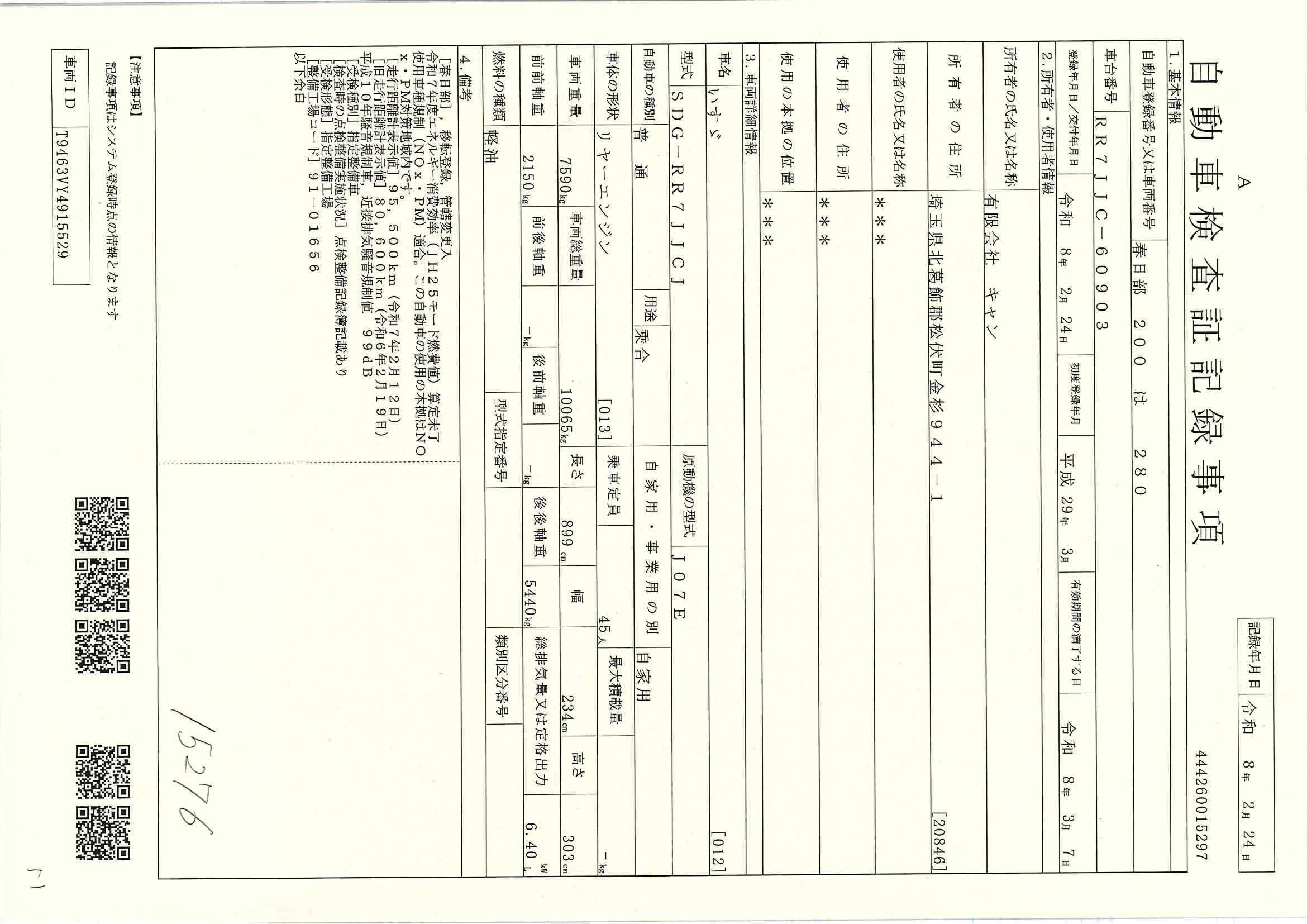 当店が把握できる車検証の表記より