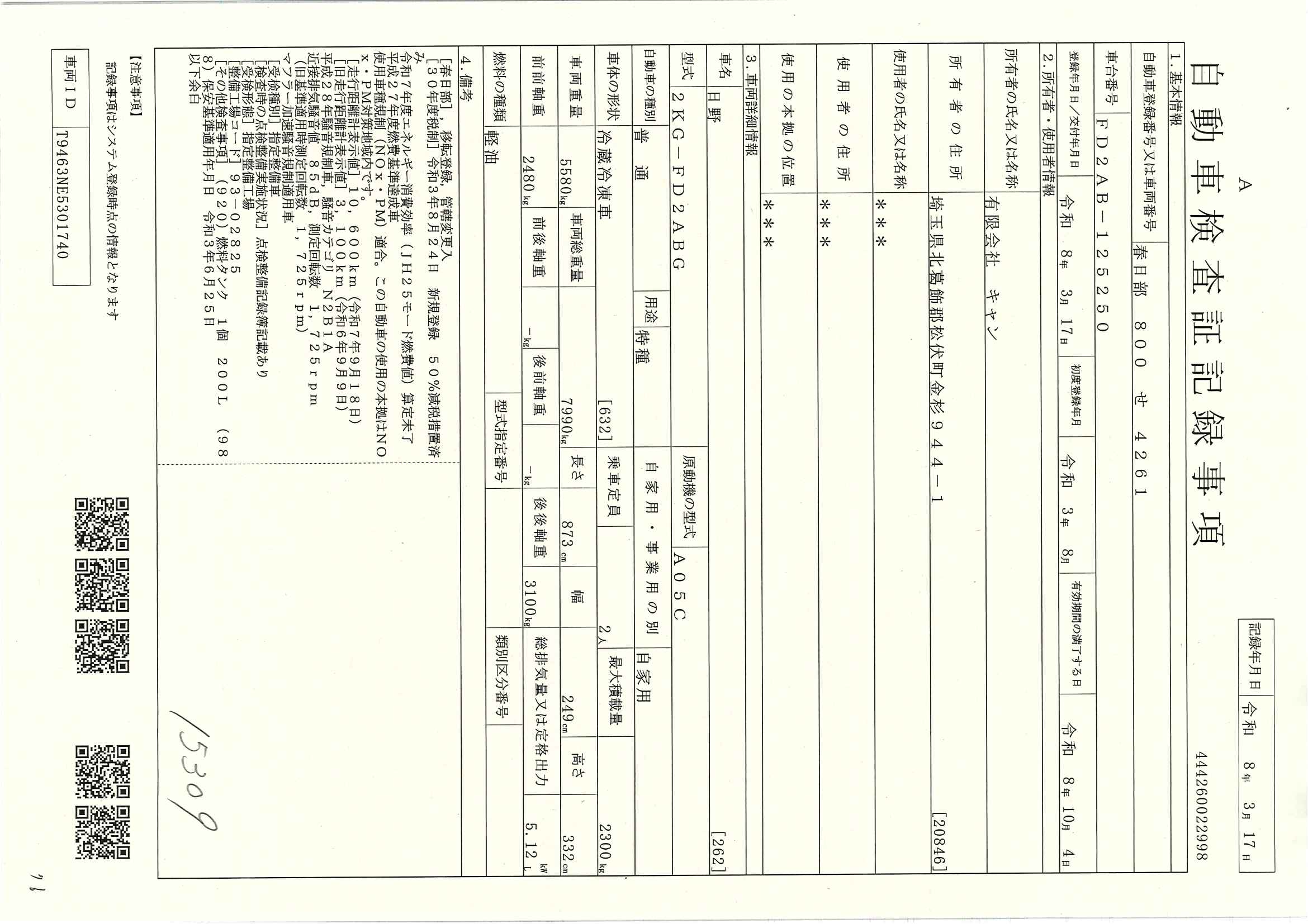 当店が把握できる車検証の表記より