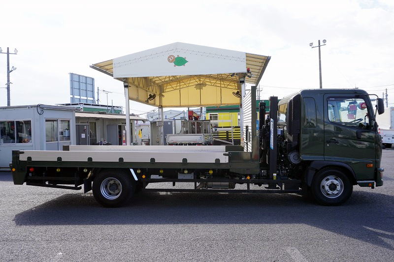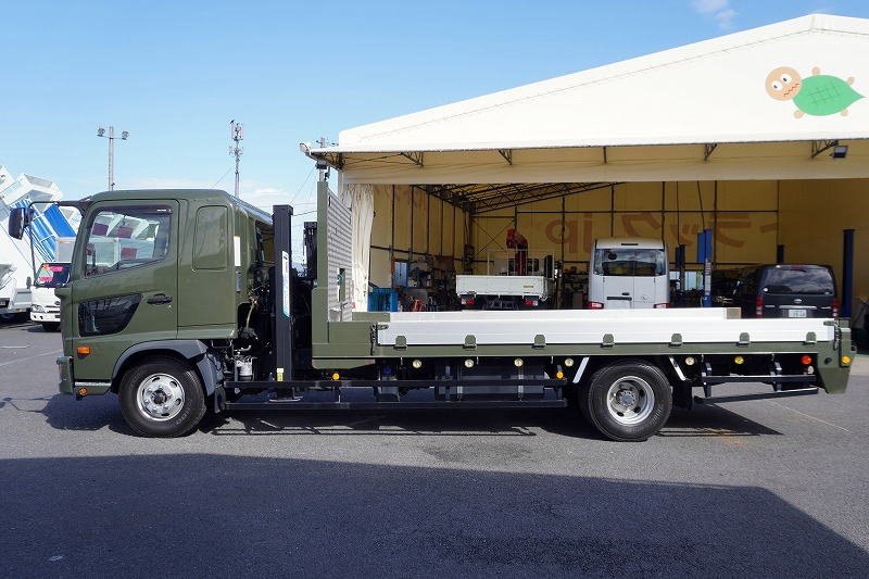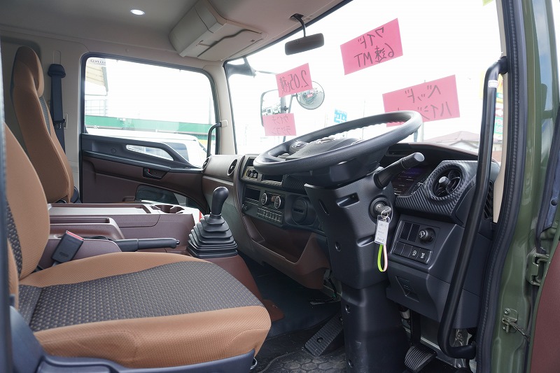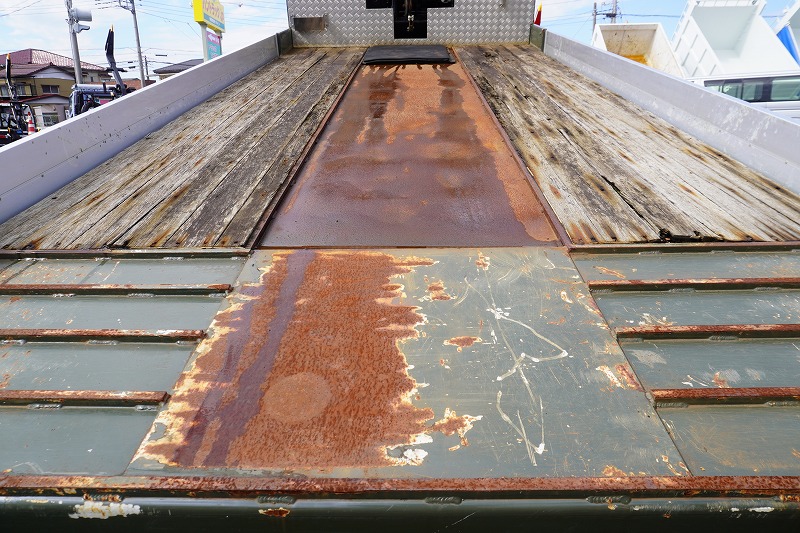 在庫No.K-0111 レンジャー 4トン 「ワイド ベッド付き」 重機運搬車 タダノ製ハイジャッキ 造りボディー 積載2050kg ウインチ ラジコン アユミ板掛け アルミブロック 鳥居シマ板張り LED作業灯 坂道発進補助 ETC 衝突軽減ブレーキ 車線逸脱警報 低走行!6速MT!