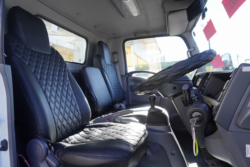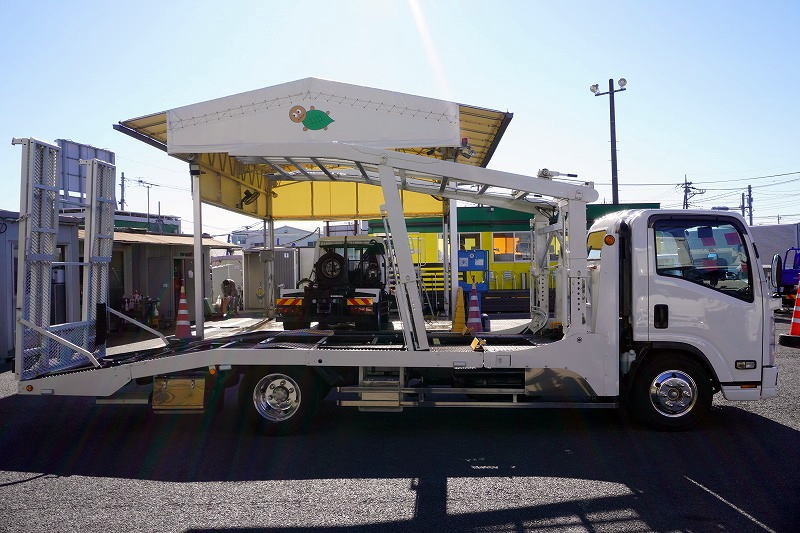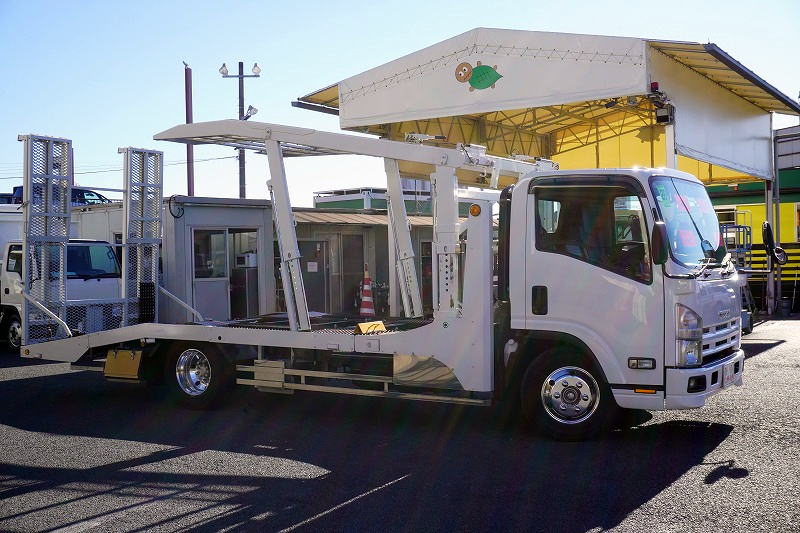 在庫No.K-0228 エルフ 「ワイド超ロング」 キャリアカー 2台積 古河ユニック製 積載3500kg ウインチ 油圧リアゲート ラジコン バックカメラ 社外ナビ ETC2.0 左電格ミラー 坂道発進補助 フォグランプ アルミホイール 6速MT! 車検「R8年11月まで!」