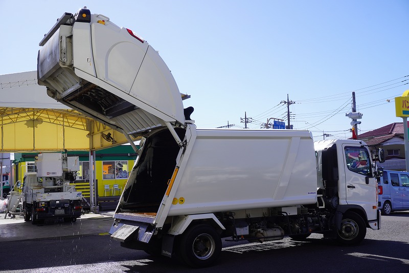 在庫No.K-0272 レンジャー 4トン 「ベッドレス」 パッカー車 プレス式 積載1500kg 10.2立米 新明和製 連続動作 防臭ドア 汚水タンク 網工具入れ バックカメラ ETC2.0 坂道発進補助 衝突軽減ブレーキ 車線逸脱警報 メッキパーツ多数!6速MT!段ボール仕様!