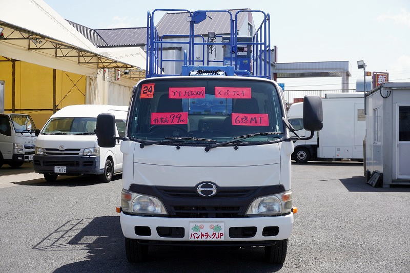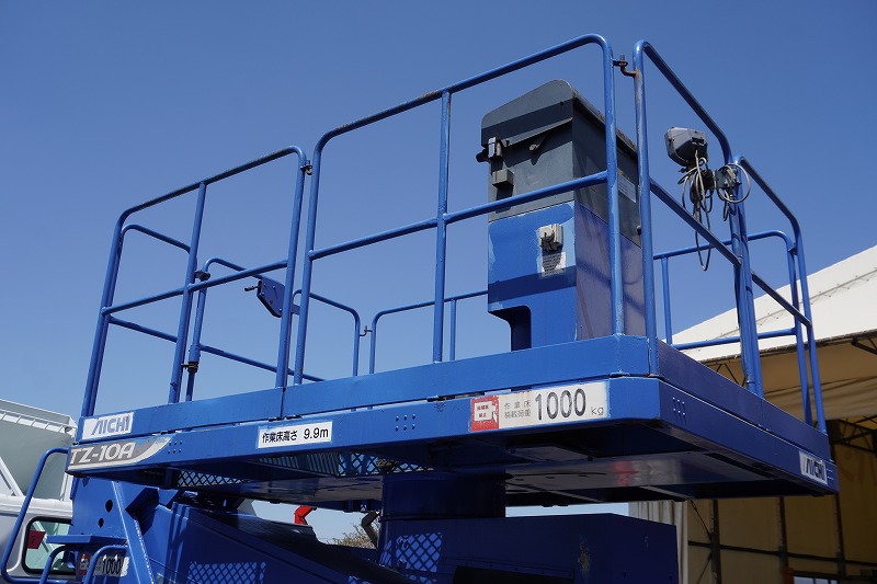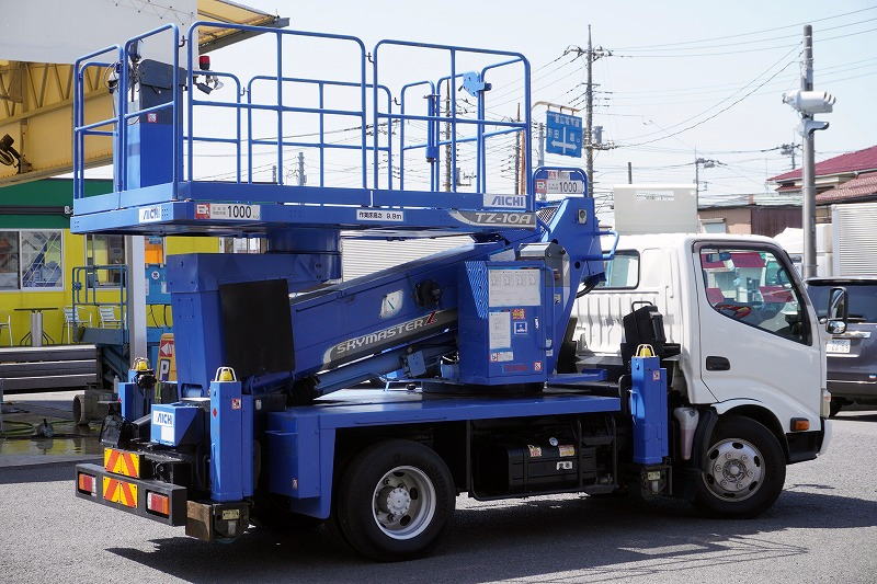 在庫No.K-0249 デュトロ 高所作業車 アイチ製(TZ10A) スーパーデッキ 重荷重型 最大地上高9.9m 鉄製バケット バケット積載荷重1000kg ローラージャッキ ブーム自動格納 アワーメーター:2544h 左電格ミラー 坂道発進補助 ETC 6速MT!