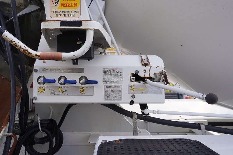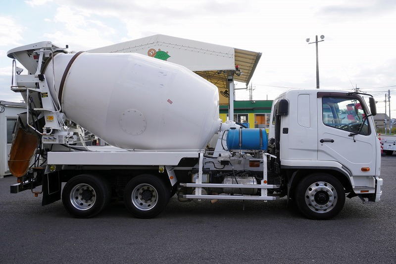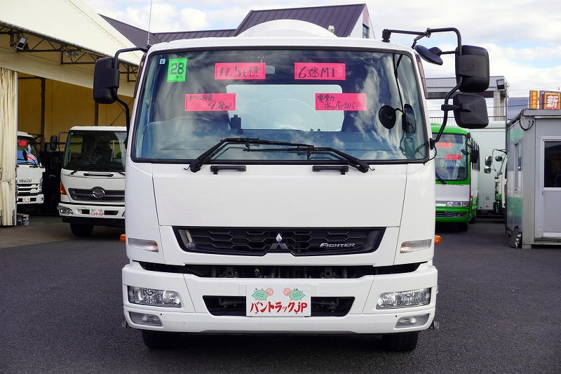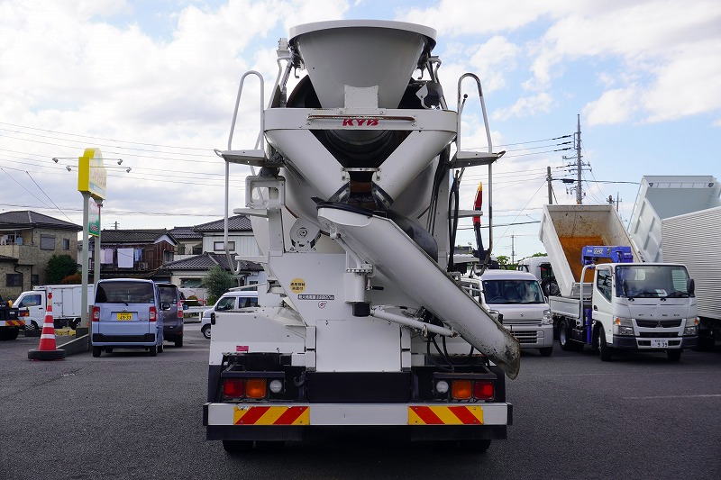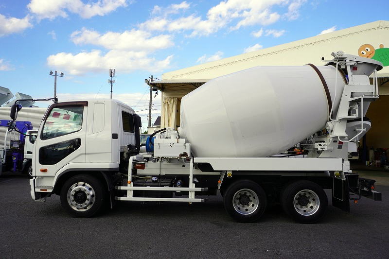 在庫No.K-0096 ファイター 大型 3軸 「ベッド付き」 コンクリートミキサー車 カヤバ製 積載11500kg 電動ホッパーカバー 水タンク 自動洗浄 ドラム容量:9.8立米 混合容量:5.0立米 アルミホイール 坂道発進補助 ミラーヒーター ETC 6速MT! 車検「R8年9月まで!」